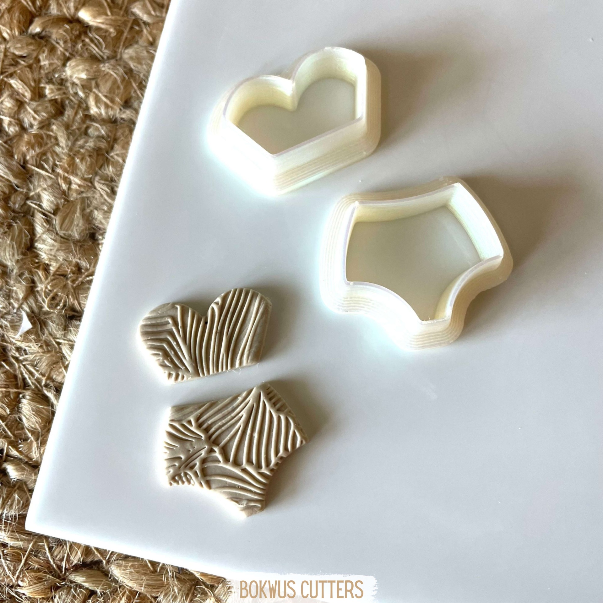 • Cortadores de biscoitos em forma de bikini branco com padrões texturizados em massa sobre placa branca