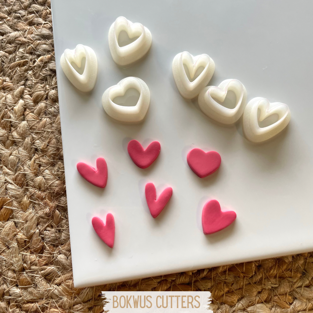 • Seis cortadores de coração brancos numa bandeja preta com texto BOKWUS CUTTERS
