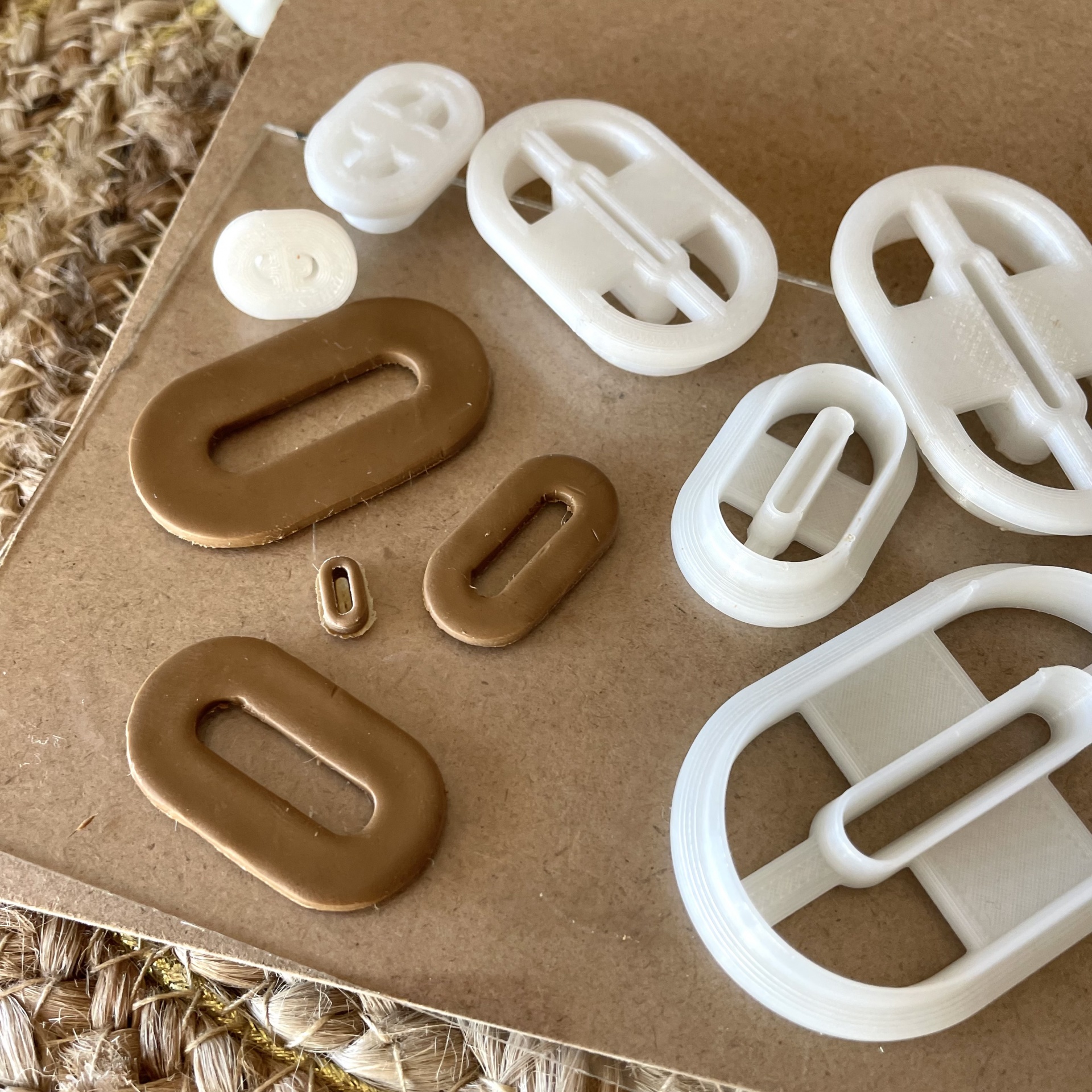• Fivelas e botões de plástico castanhos e brancos em vários tamanhos sobre cartão