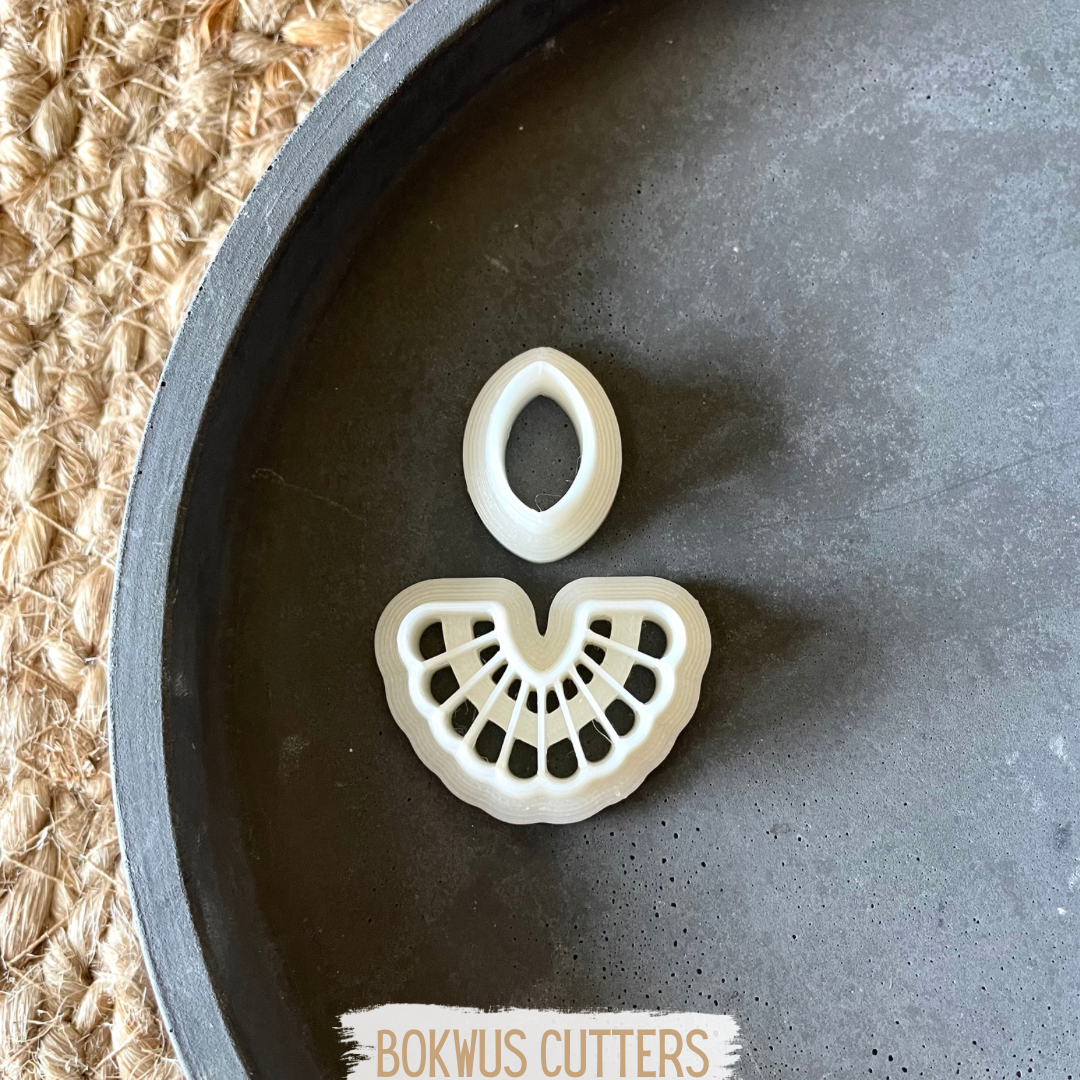 • Conjunto de cortadores de bolacha semicirculares brancos e marrons sobre placa branca com fundo de tecido natural