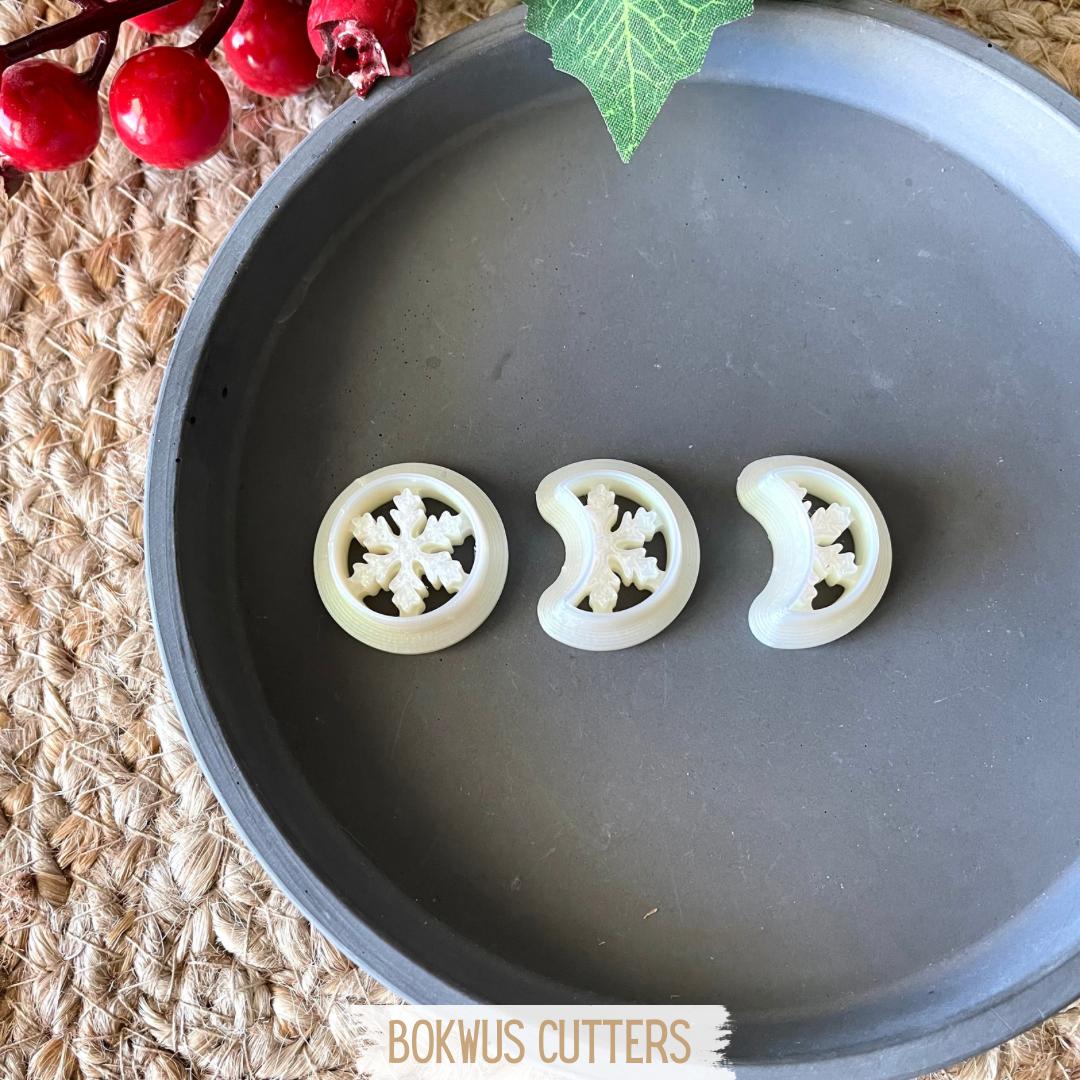 • Três cortadores de massa em forma de floco de neve numa travessa cinza