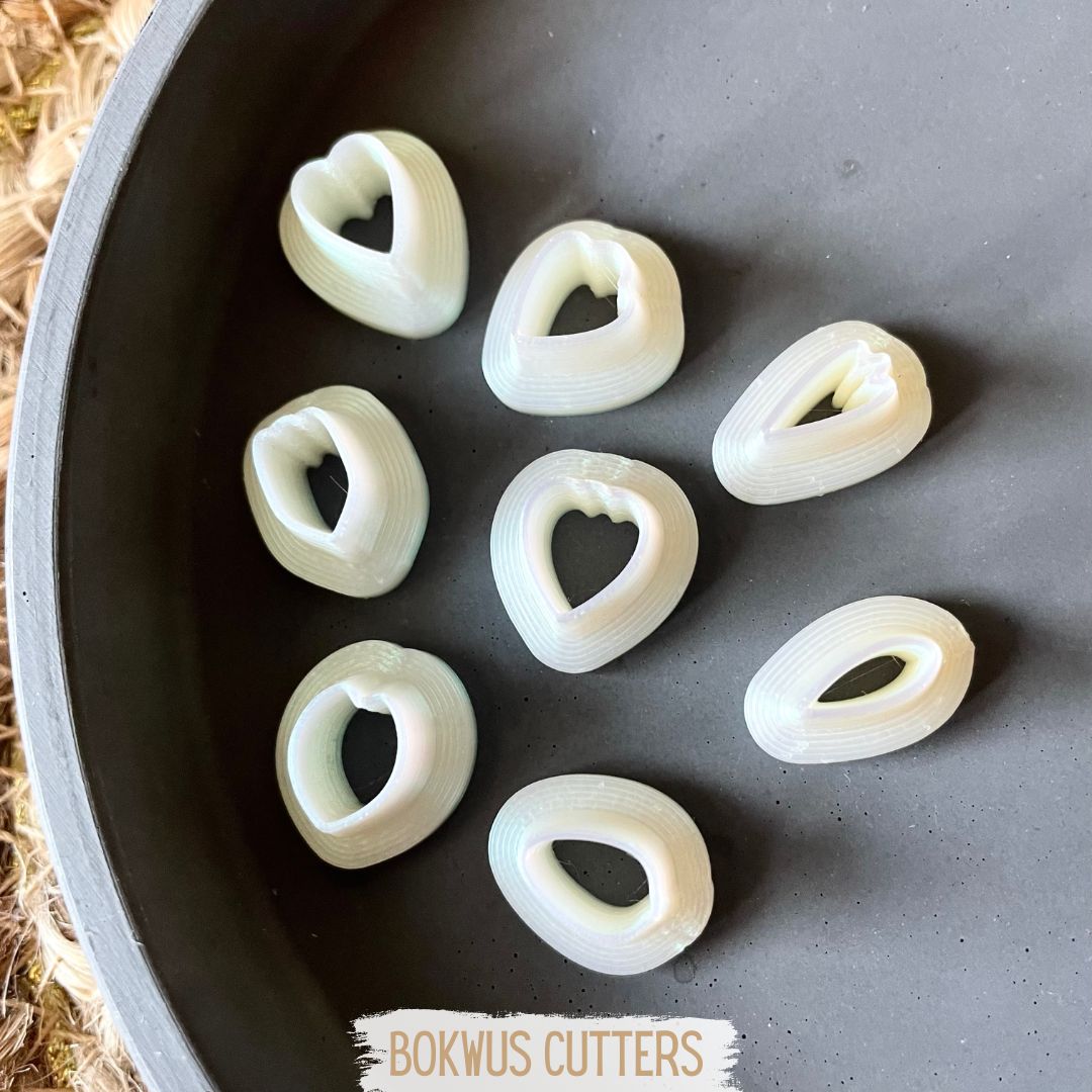 • Conjunto de cortadores de biscoitos brancos em forma de coração e oval sobre superfície preta