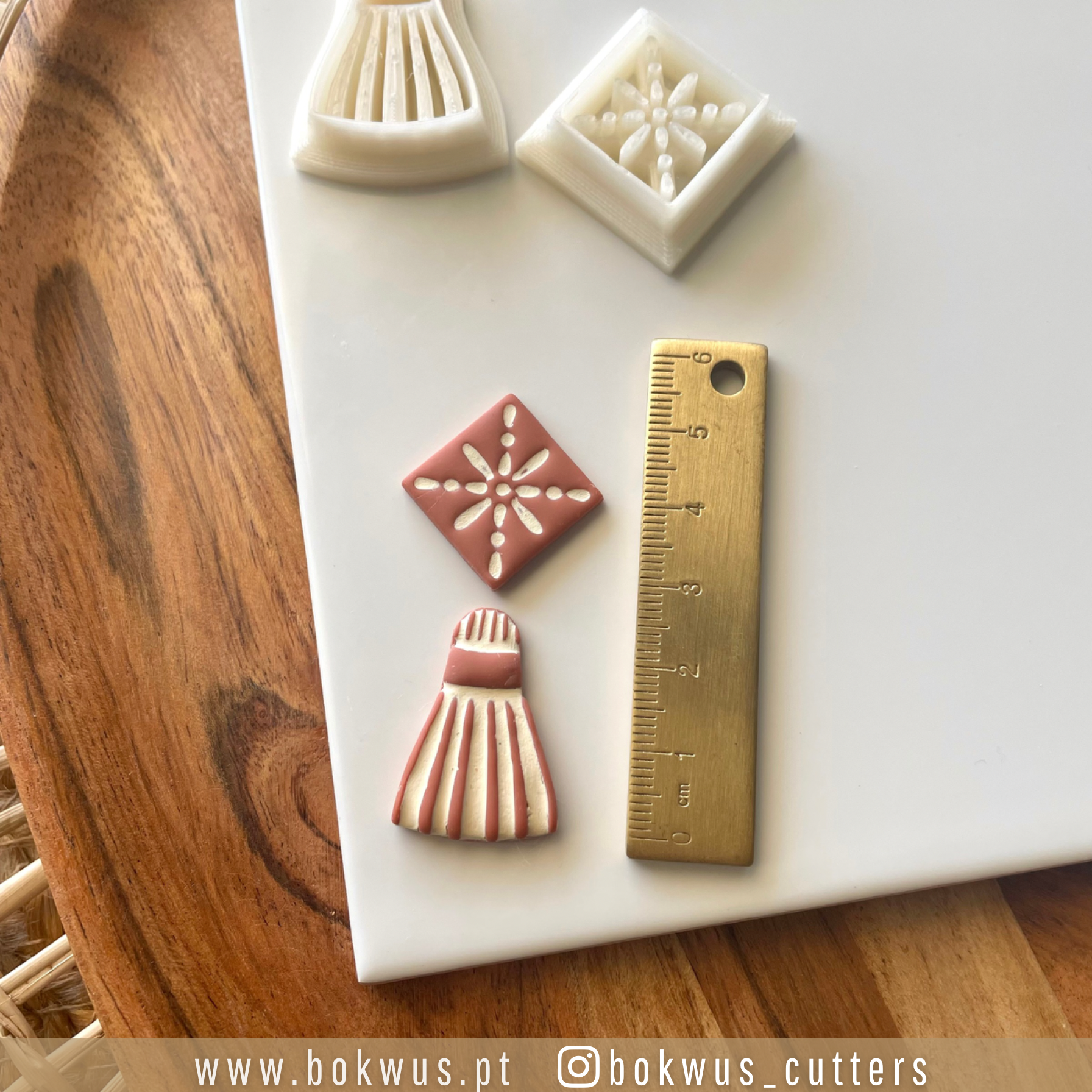 • Cortadores de massa em plástico branco com desenhos detalhados e régua metálica dourada sobre superfície de madeira