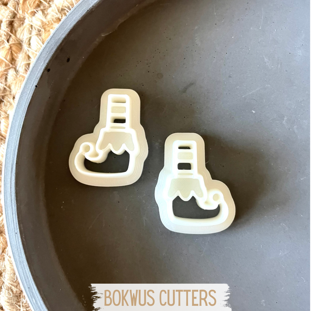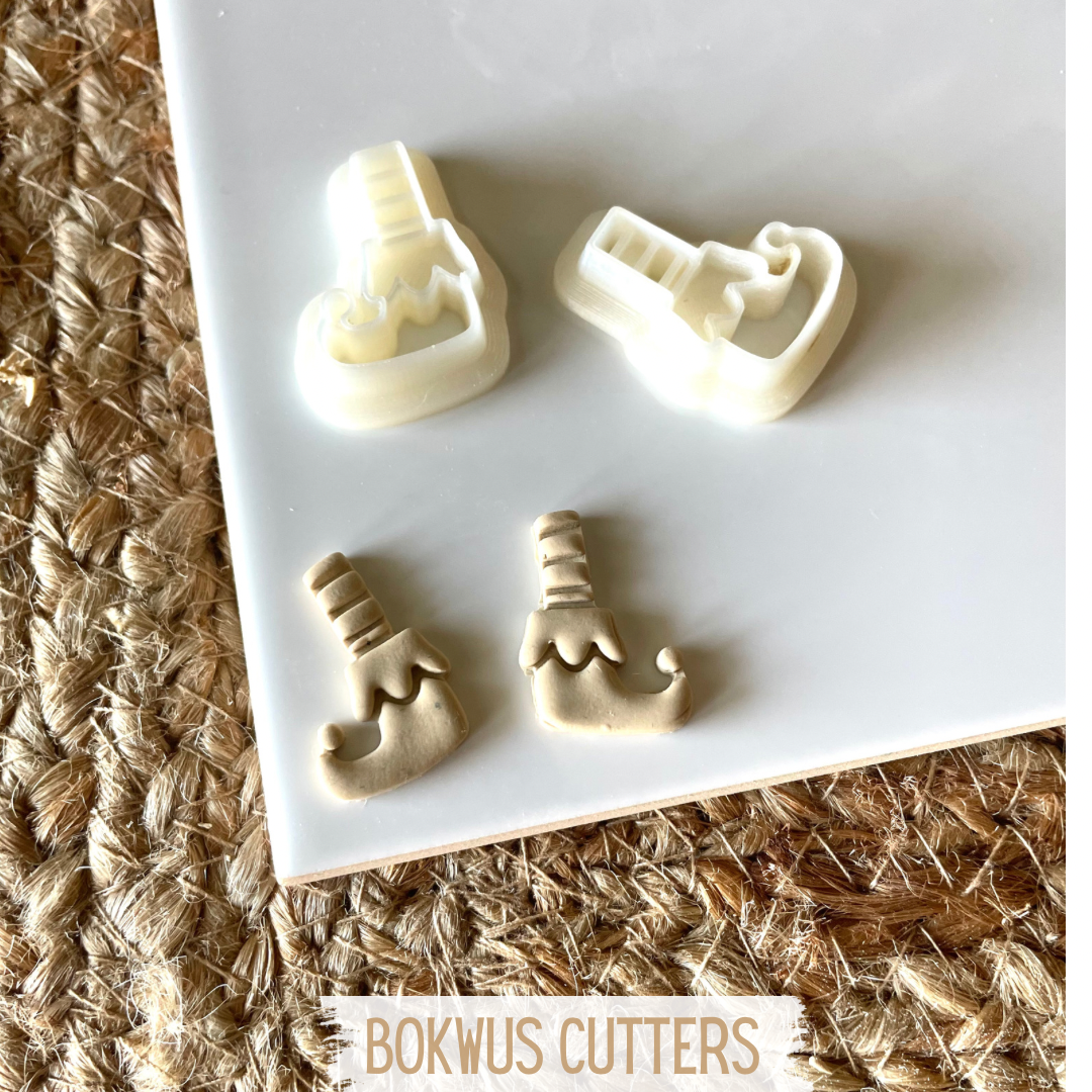 Dois cortadores em forma de bota de Natal brancos sobre prato cinzento