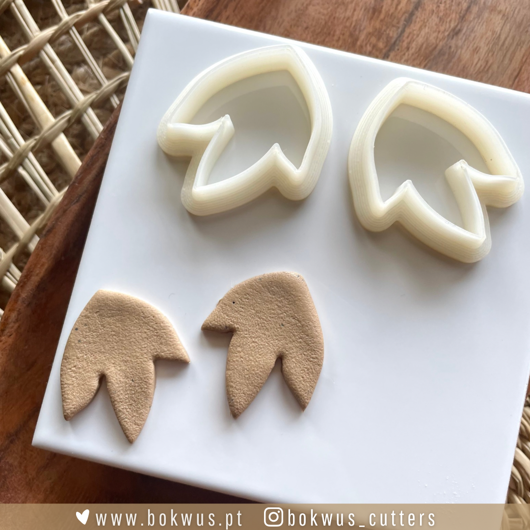 • Dois cortadores de biscoitos brancos em formato de folha ou pata, com duas formas de massa castanha cortada, sobre base branca e superfície de madeira clara com cadeira rattan ao fundo