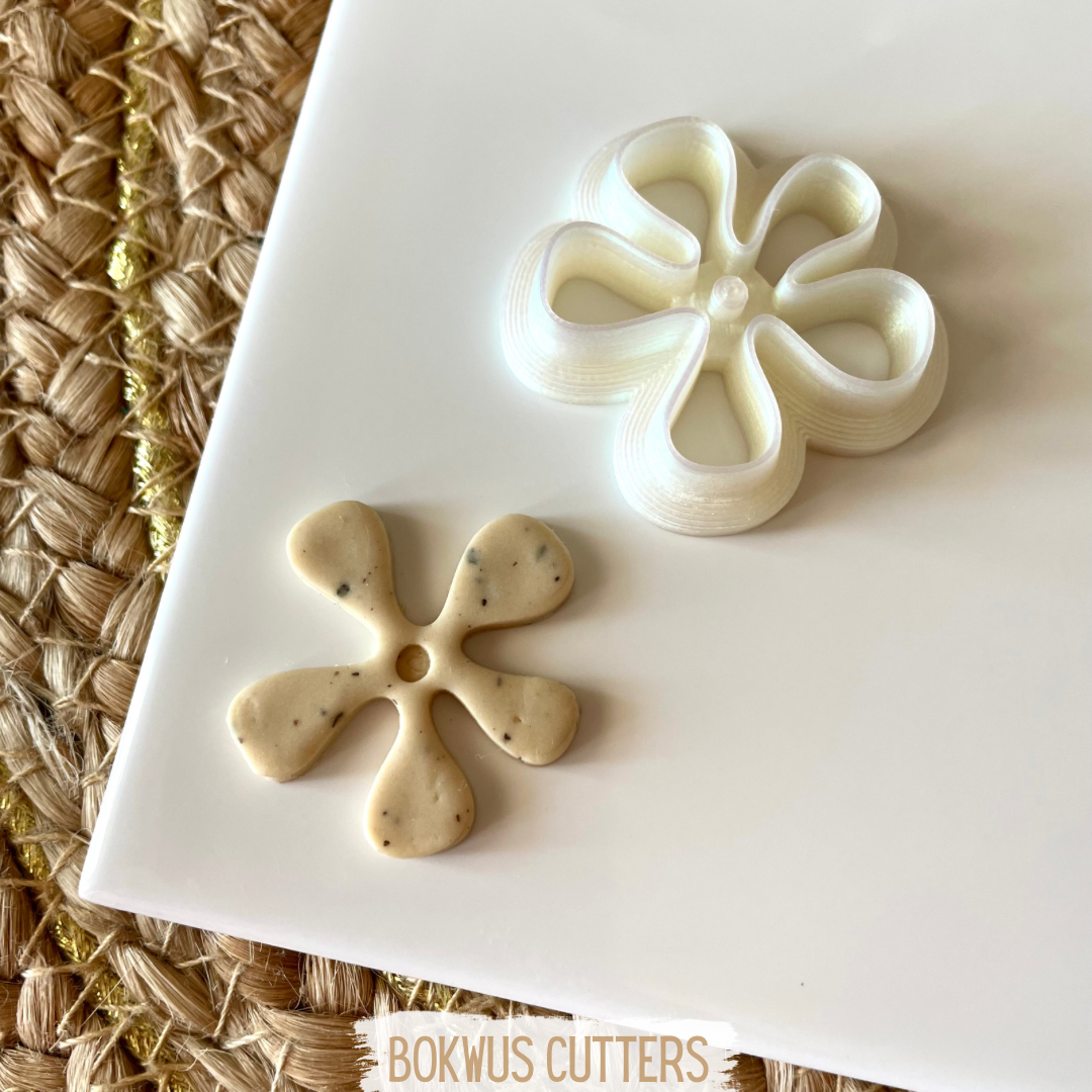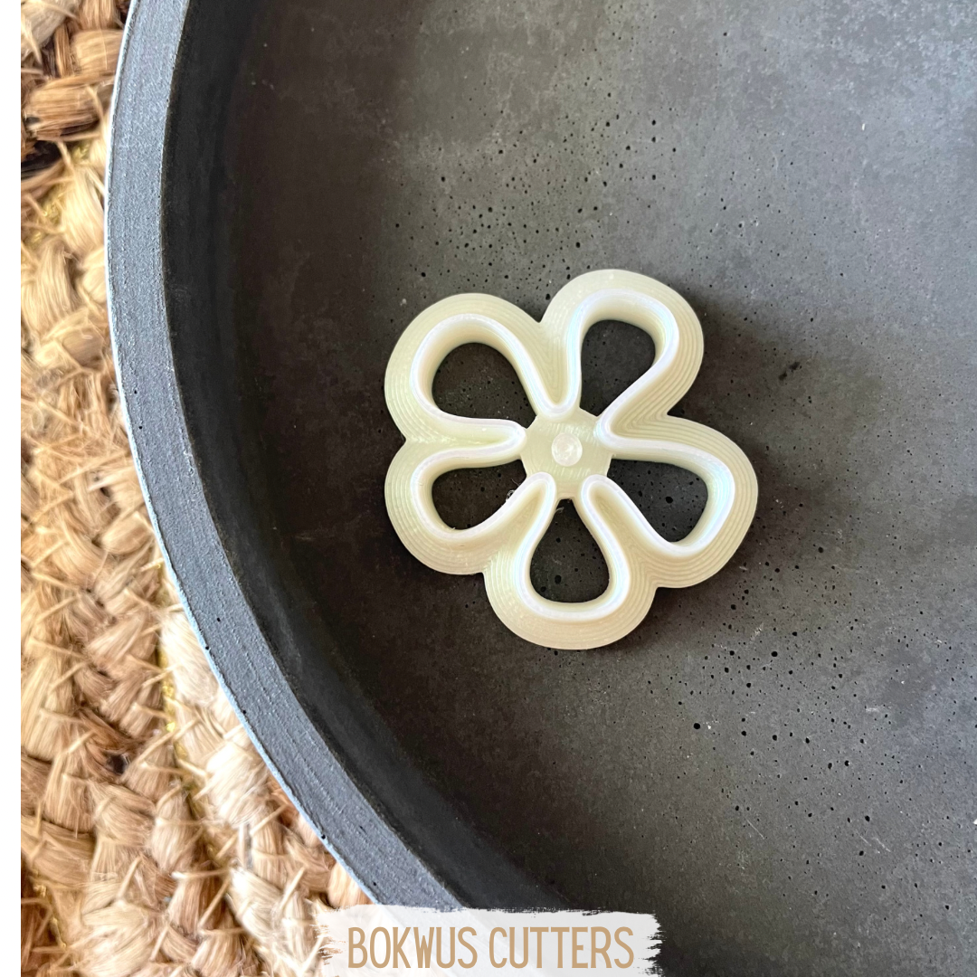 • Cortador de bolachas em forma de flor branco numa tigela cinzenta sobre tecido trançado