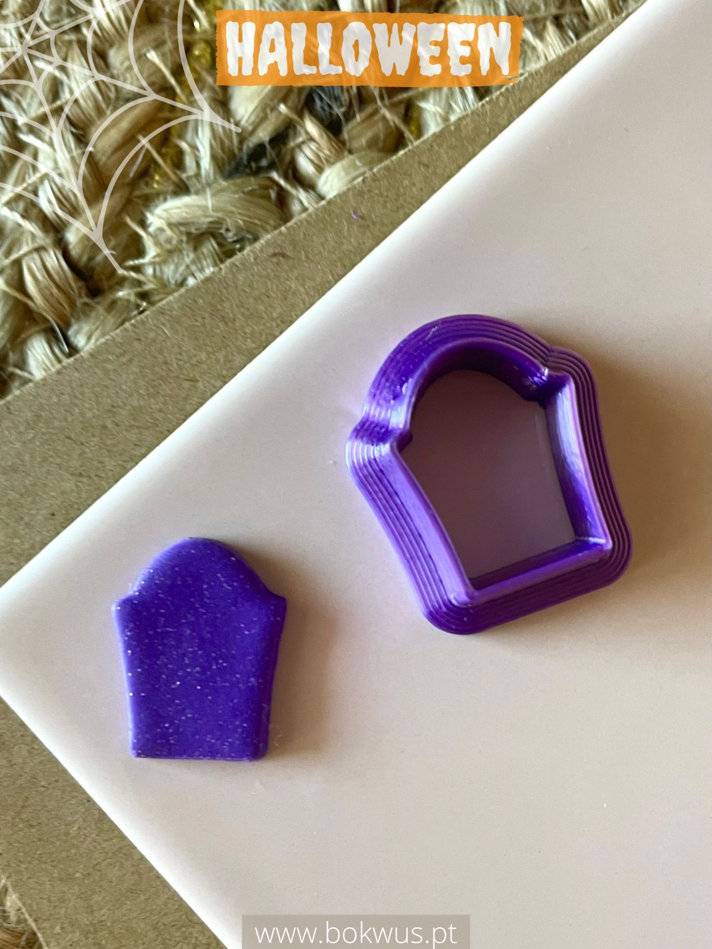 • forma de cortar bolachas roxa com bolacha cortada e texto HALLOWEEN