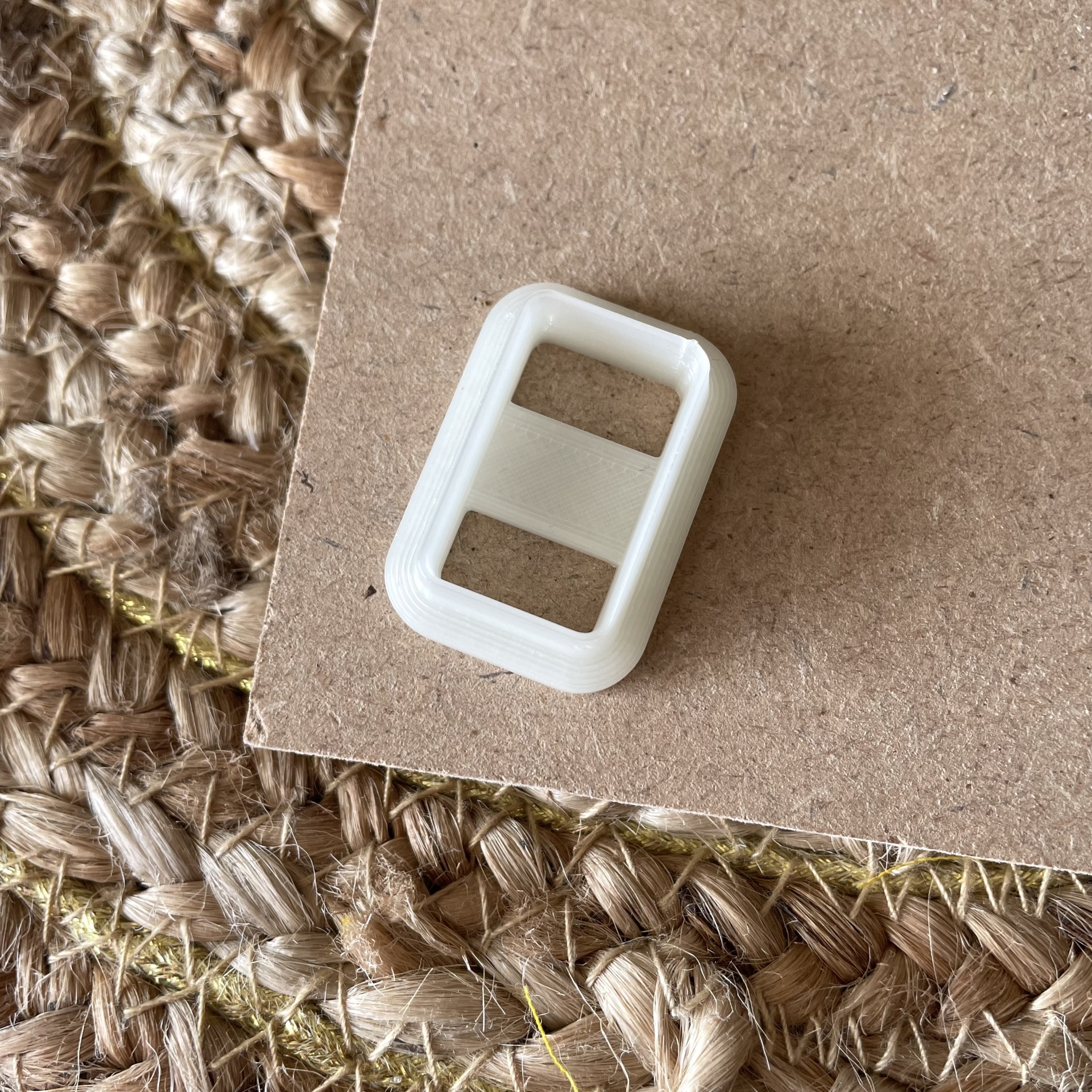• Trava de plástico branco retangular sobre cartão castanho e tecido natural trançado