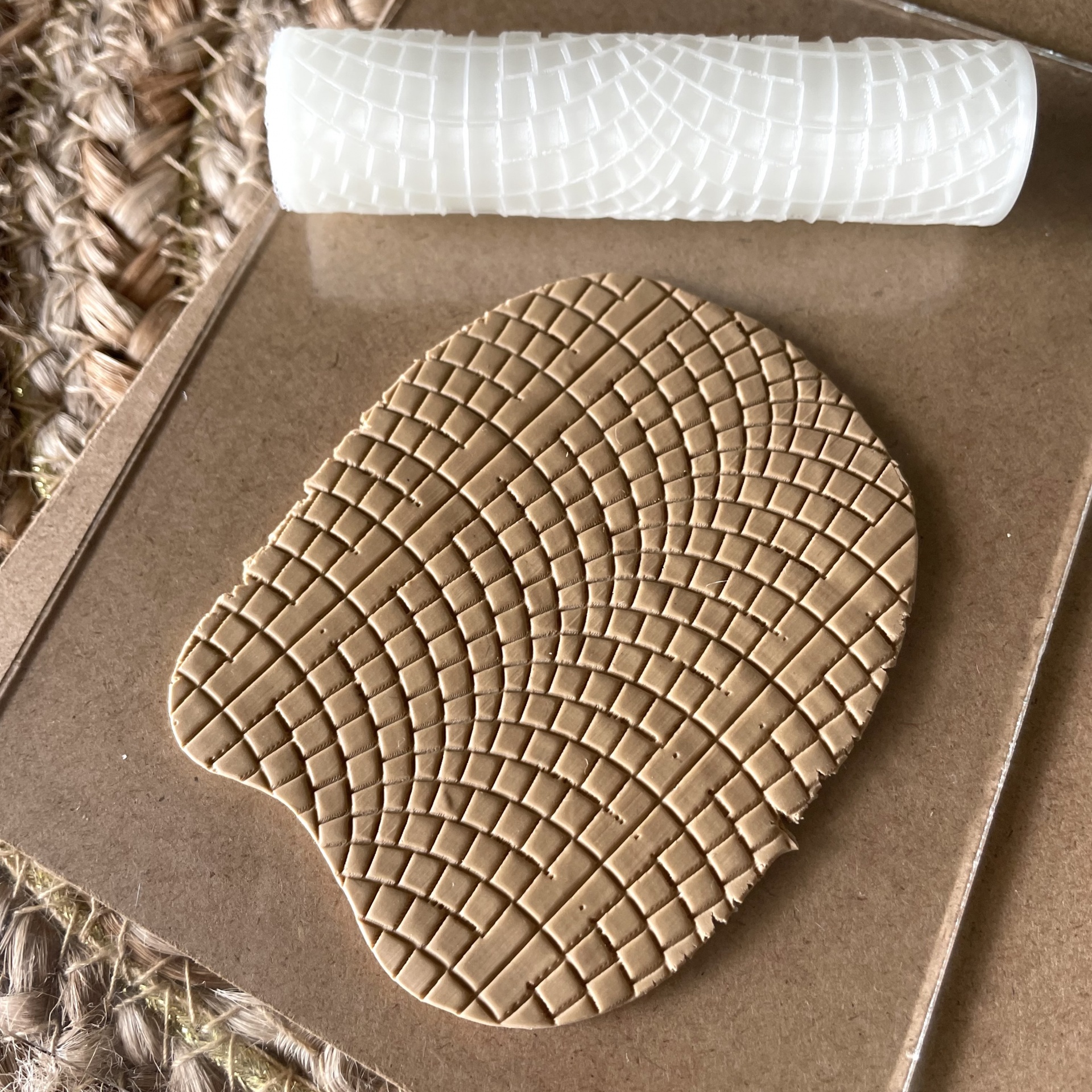 • Rolo texturizador branco e massa bege com padrão quadriculado em ondas sobre cartão castanho