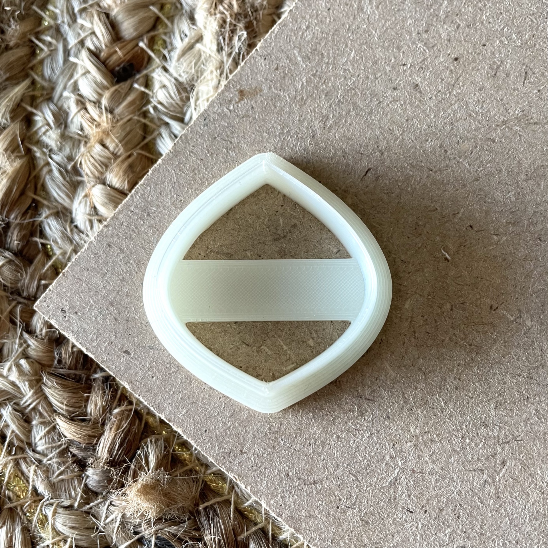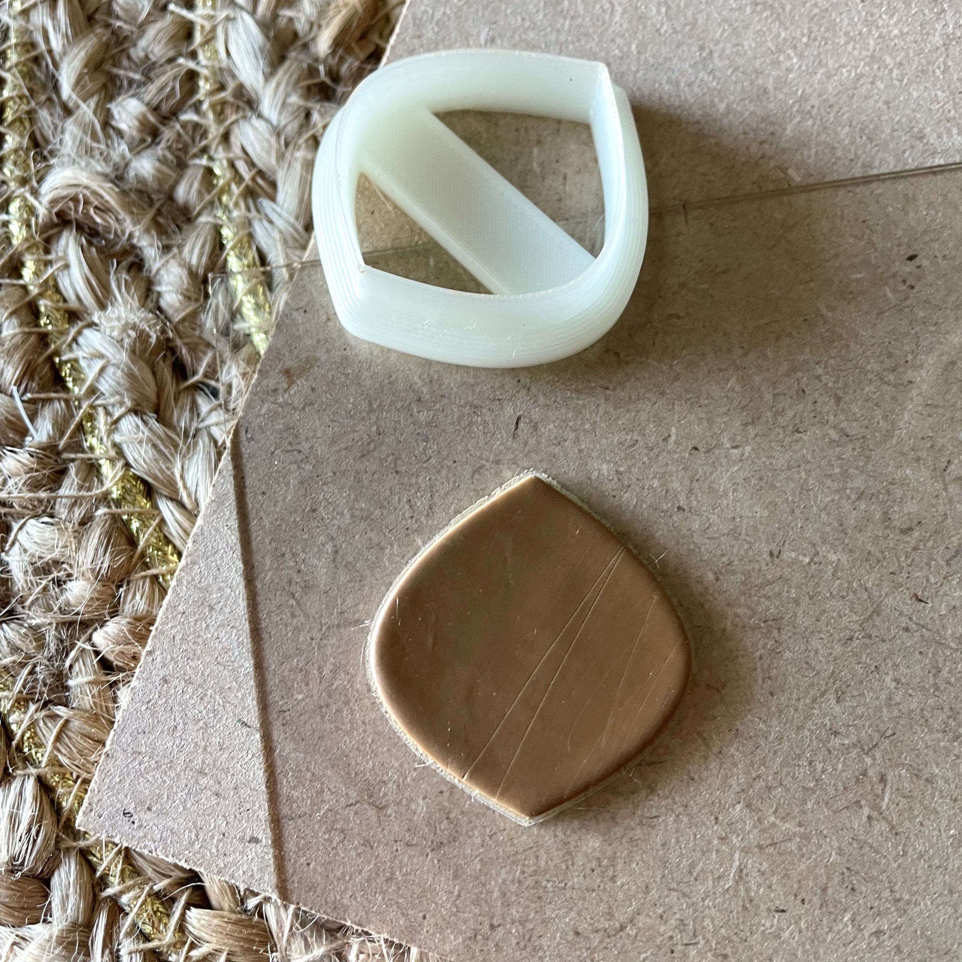 • Cortador branco em forma de losango e peça de massa bege em superfície de cartão com tapete de fibras ao lado