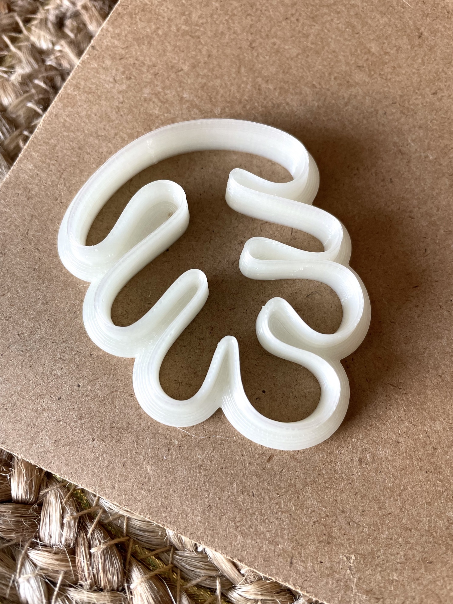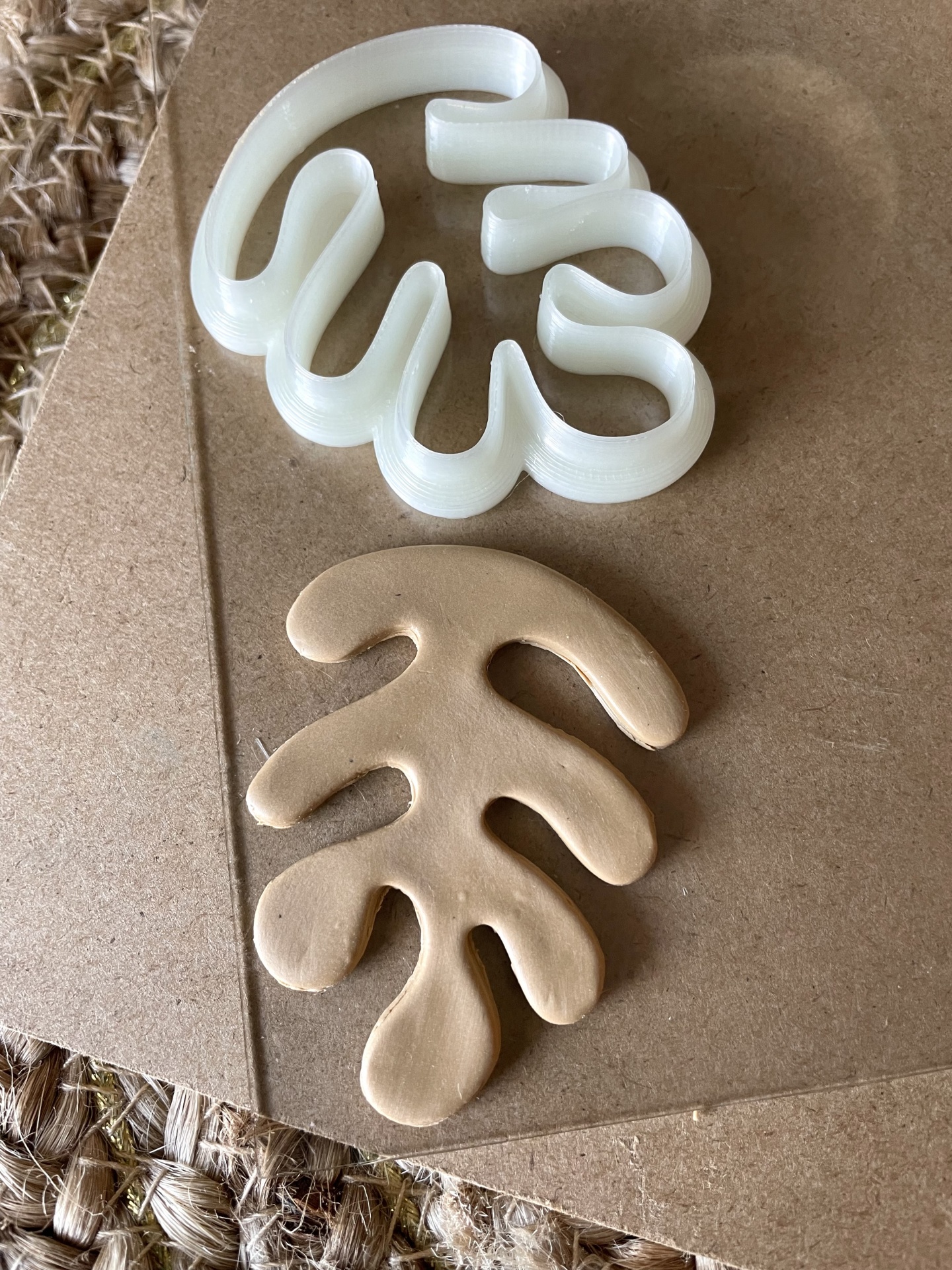 • Dois moldes em forma de folha, um branco e outro bege, sobre cartão e tapete trançado.