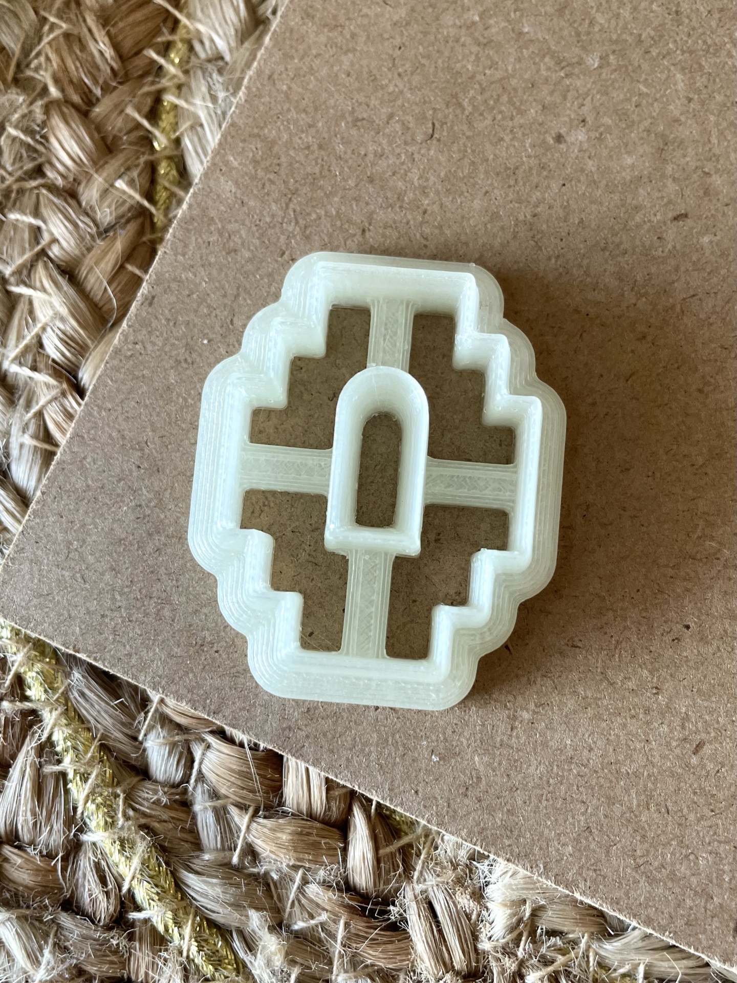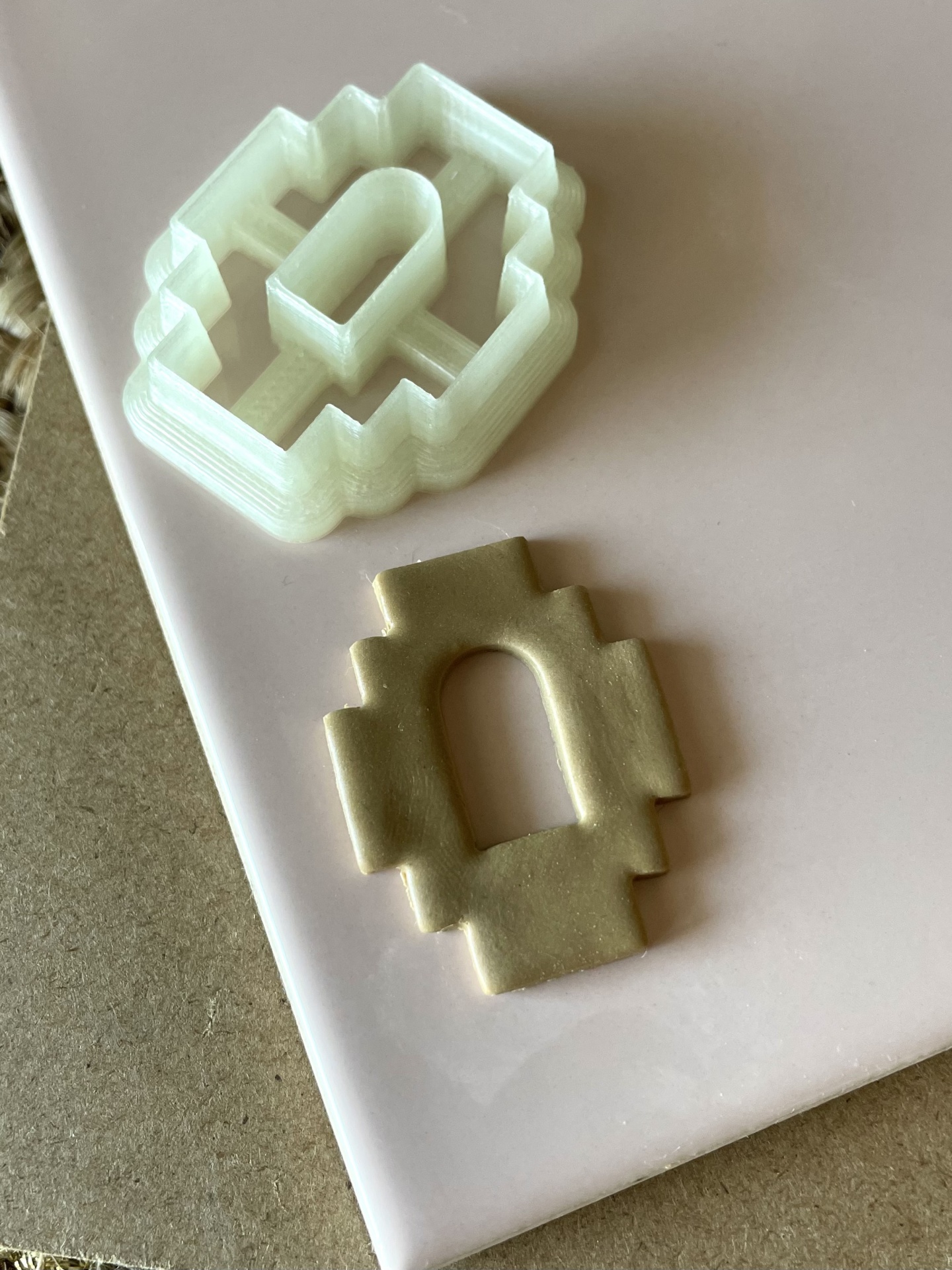 • Cortador de massa branco e peça em massa em forma geométrica sobre placa rosa clara.