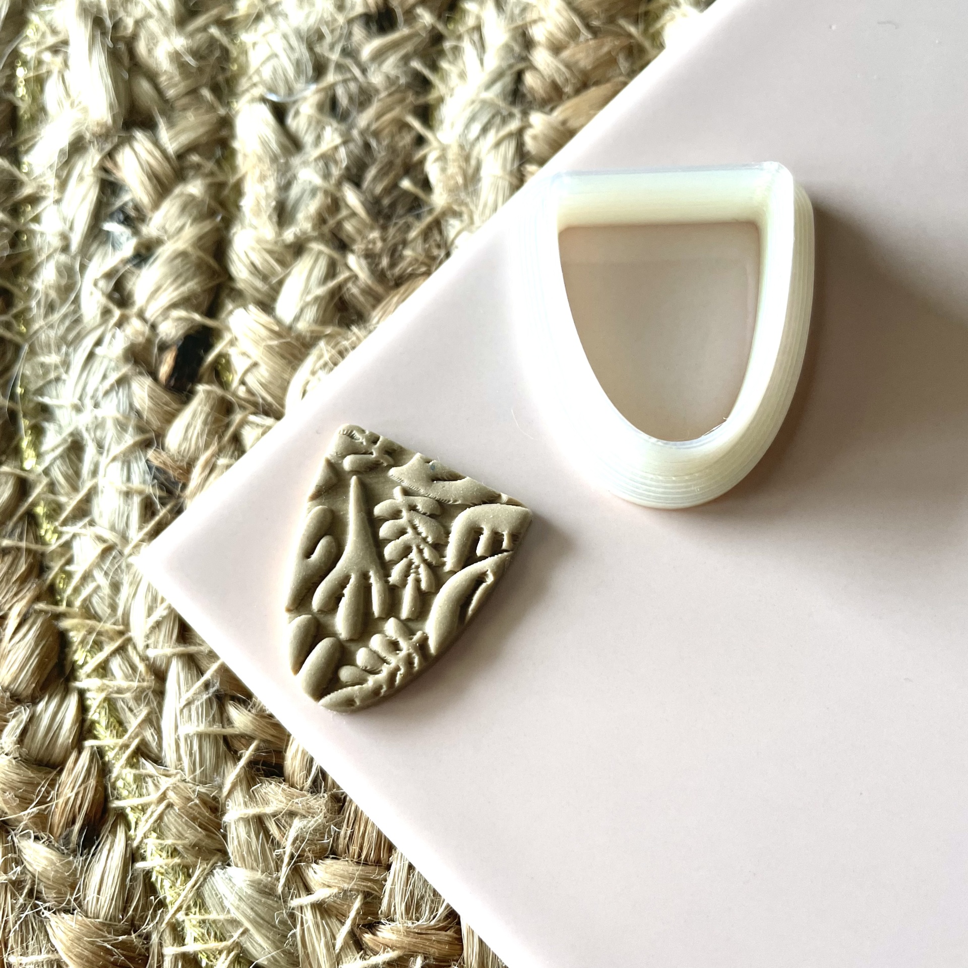 • Pequenos objetos decorativos sobre superfície branca e tapete de fibra natural