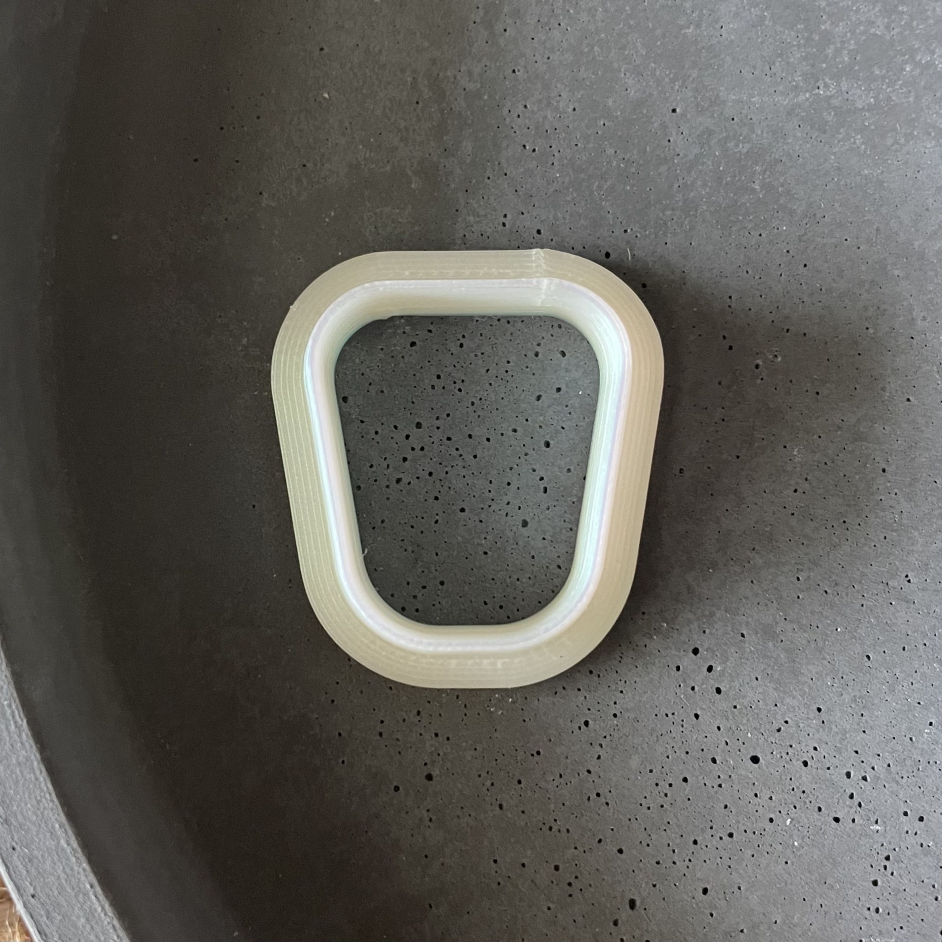 Peça moldada em plástico bege claro sobre superfície cinza porosa