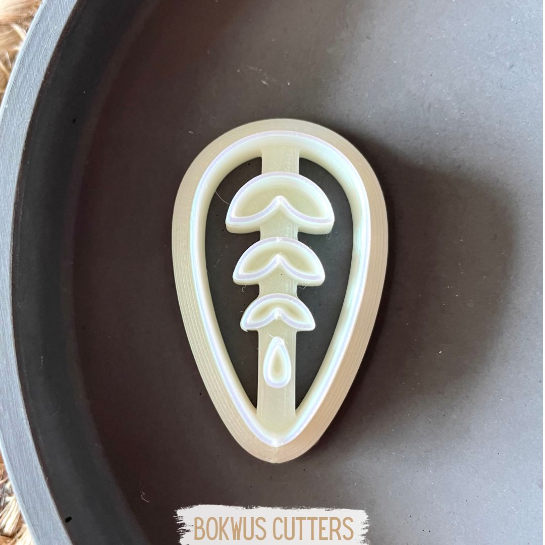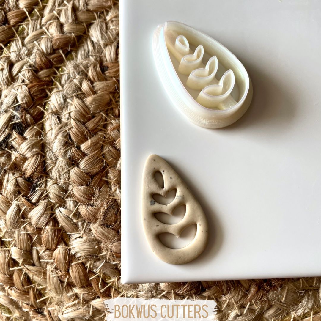 • Cortador de massa em formato de gota com padrão de folhas e peça cortada semelhante sobre fundo branco e cestaria.
