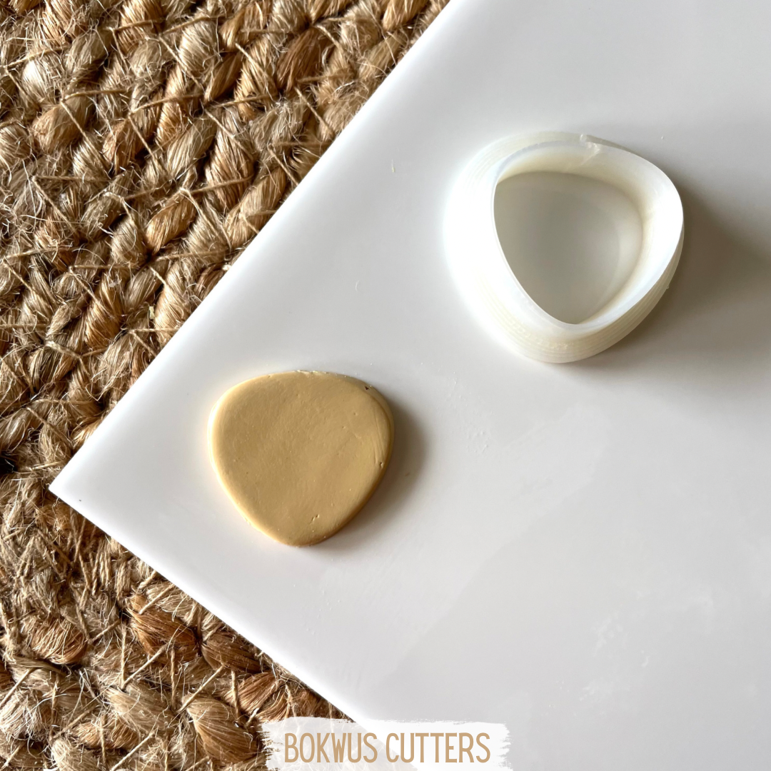 Cortador triangular de plástico branco sobre superfície cinzenta com etiqueta BOKWUS CUTTERS