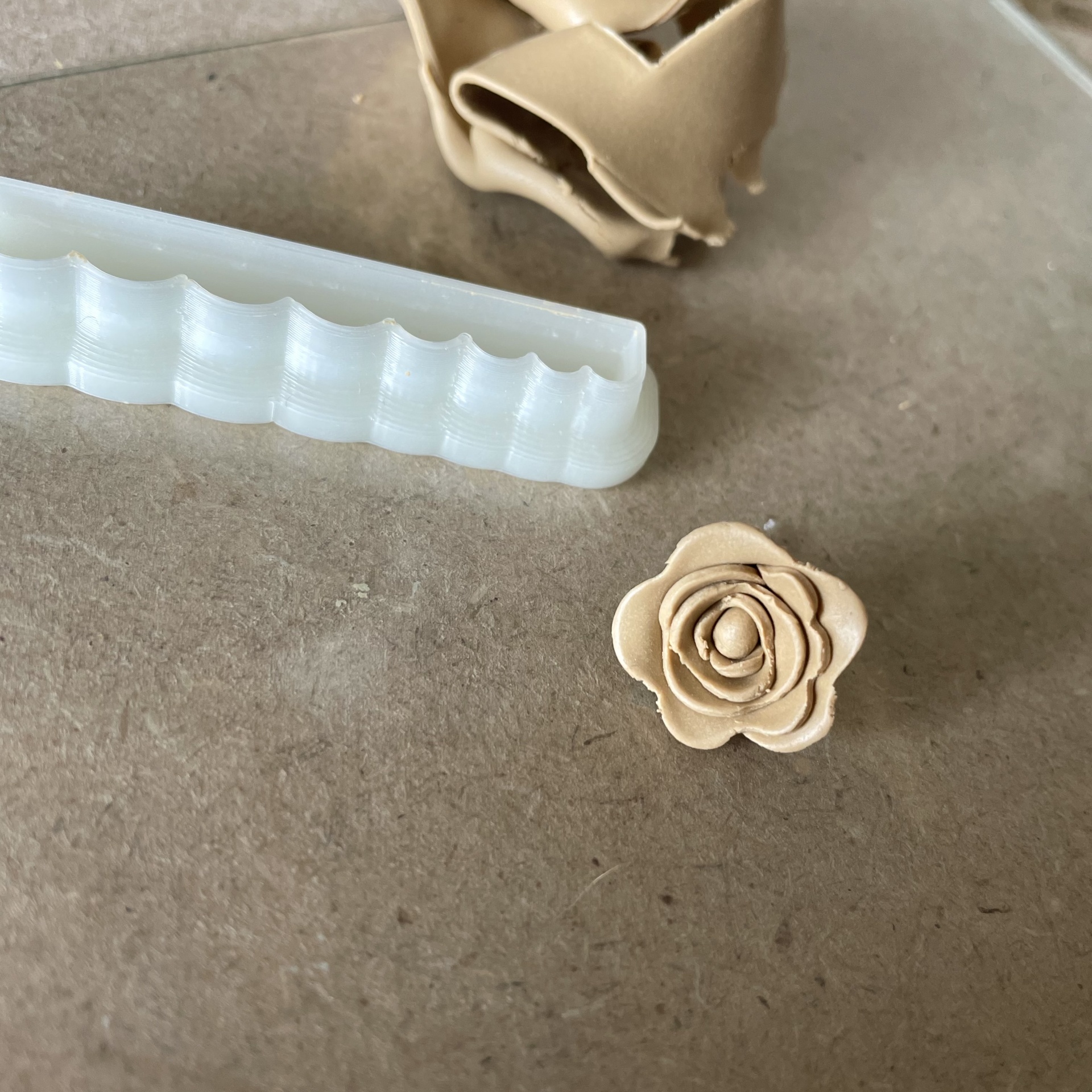 • Flor bege pequena feita de material macio com rolo texturizador branco ao lado