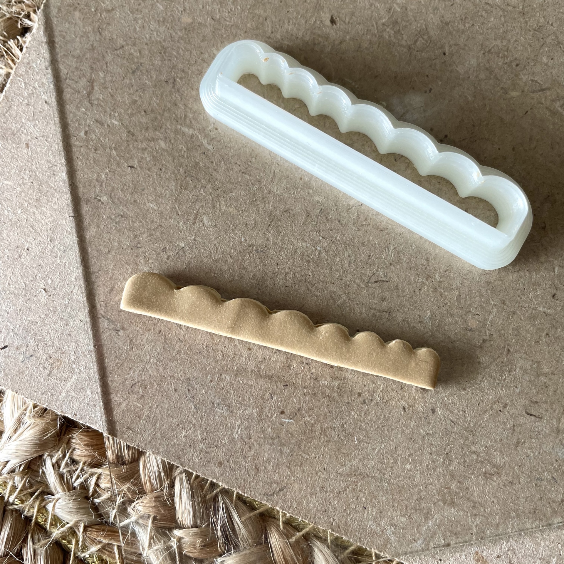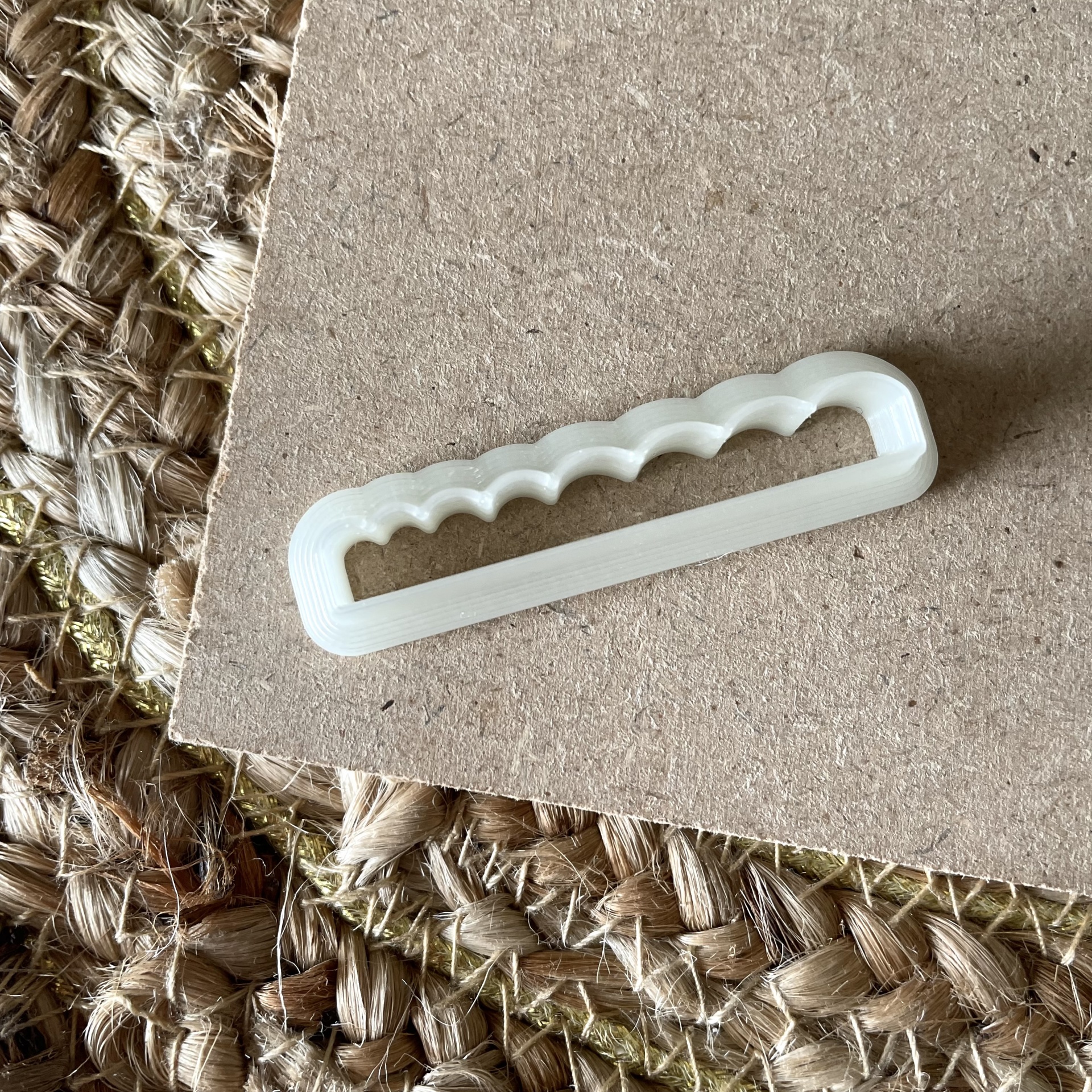 • Cortador de plástico branco com bordas onduladas sobre madeira e tapete de fibras naturais.