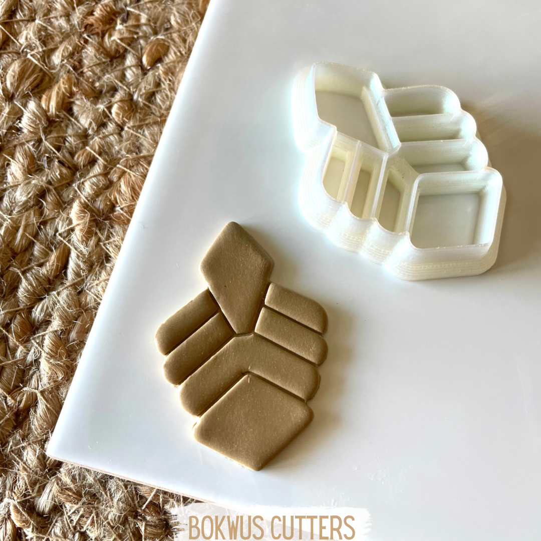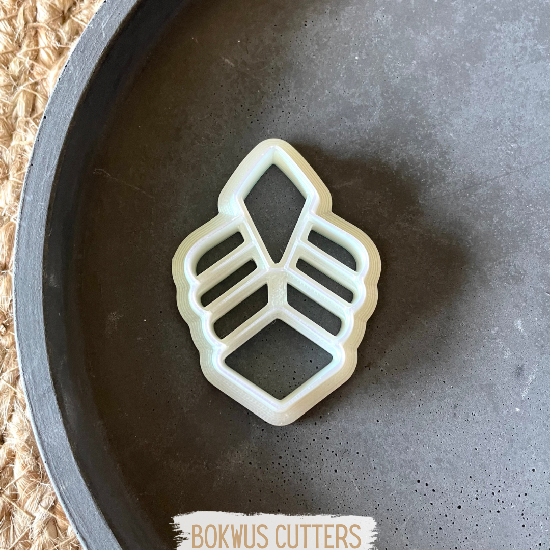 • Cortador de bolachas branco em forma de folha num prato cinzento.