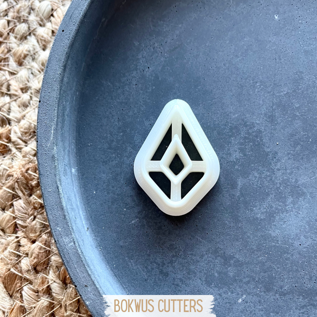 Cortador de massa branco em forma geométrica num prato preto sobre superfície têxtil rústica