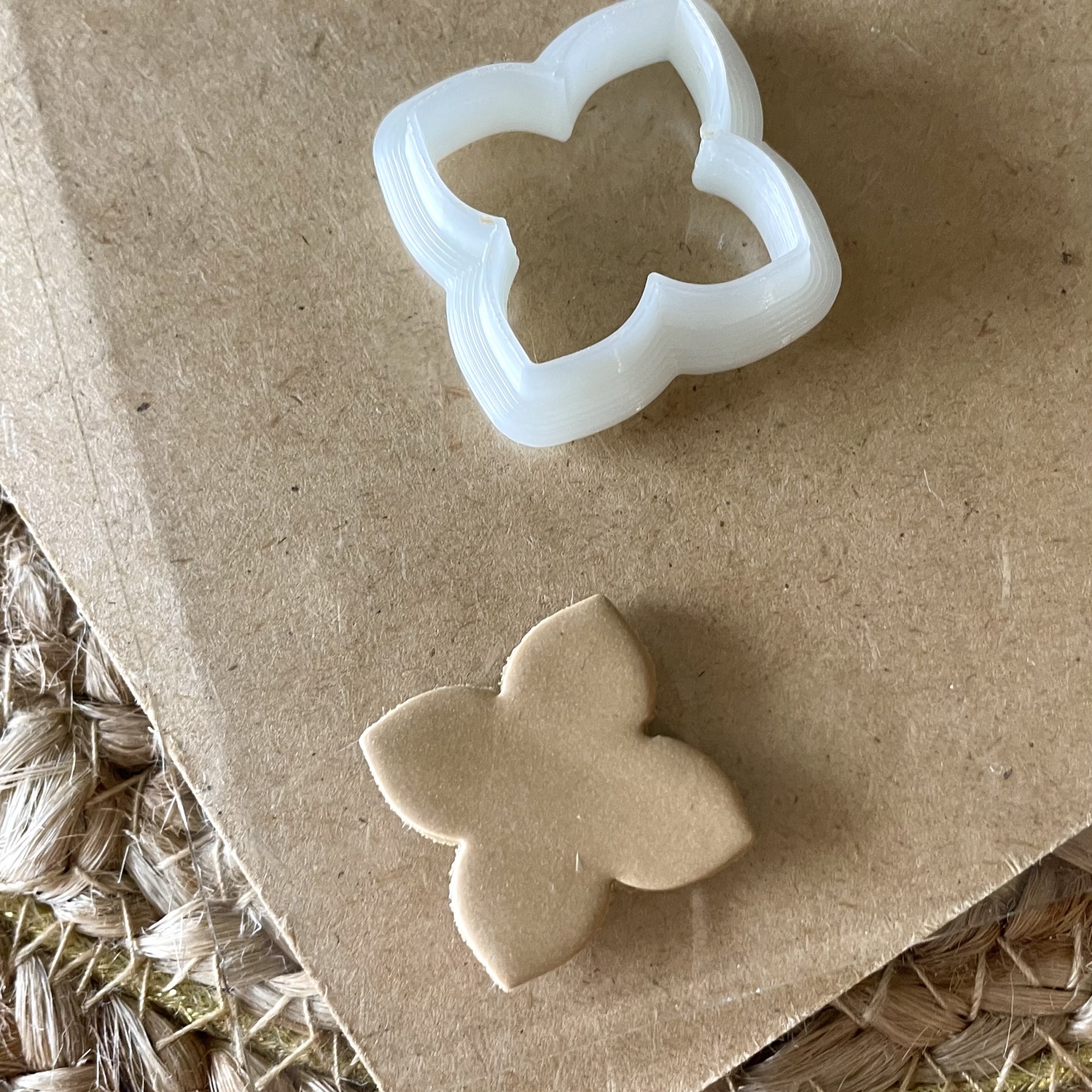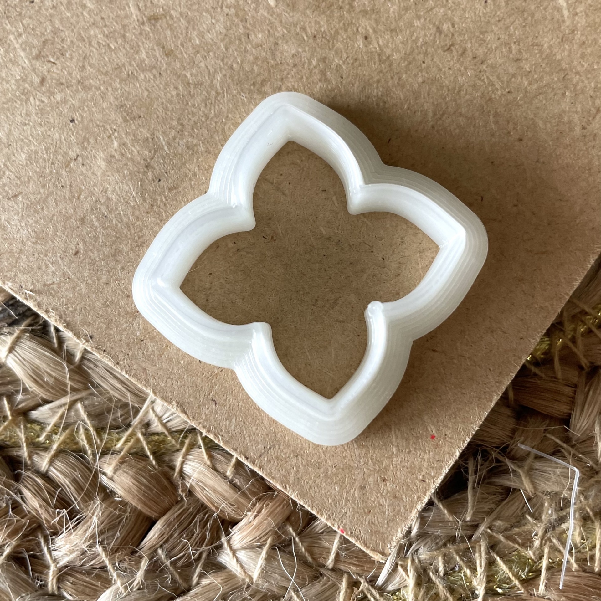 Forma branca de plástico e peça em massa bege com quatro pétalas sobre cartão e tecido trançado