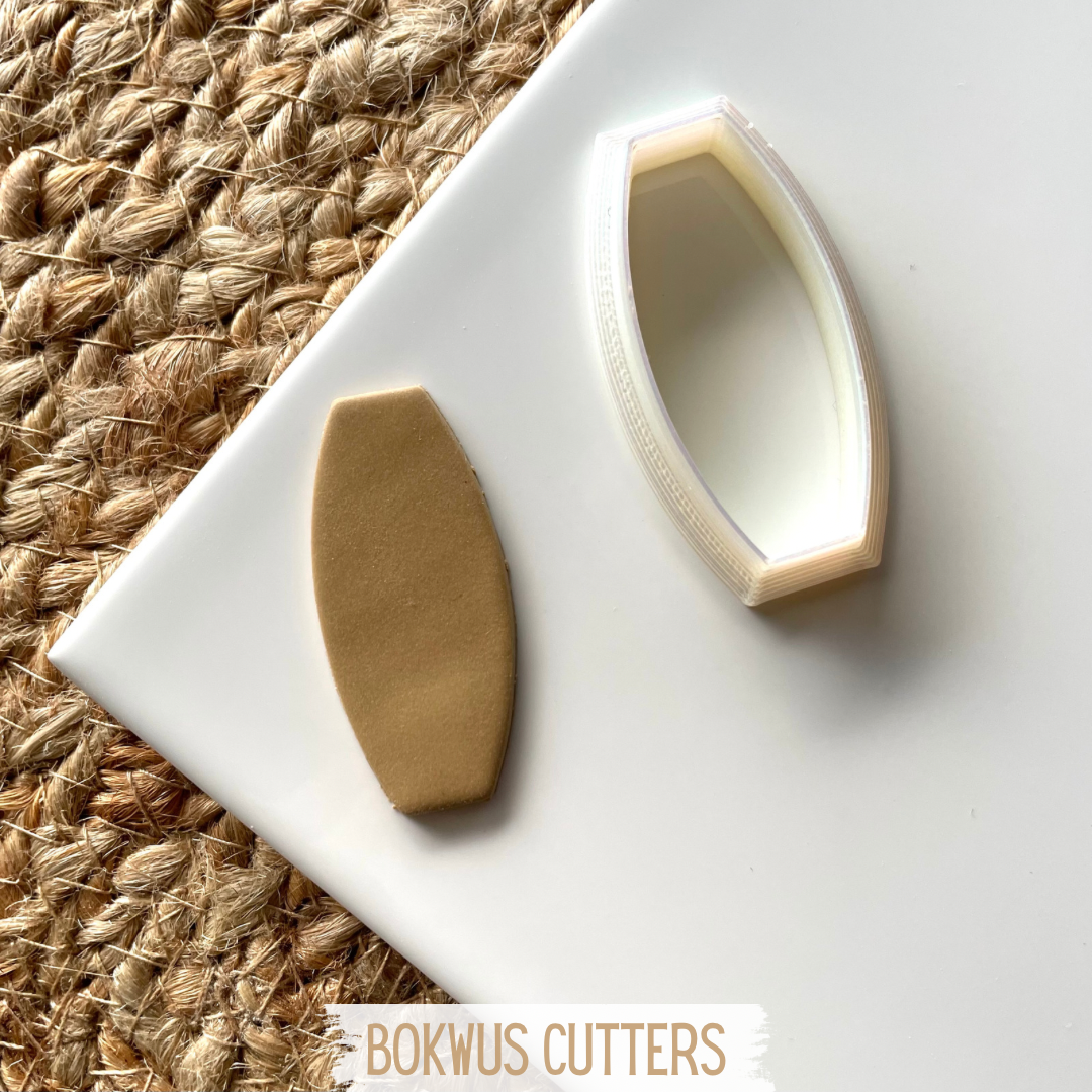 • Cortador de massa oval branco em superfície cinzenta com texto BOKWUS CUTTERS
