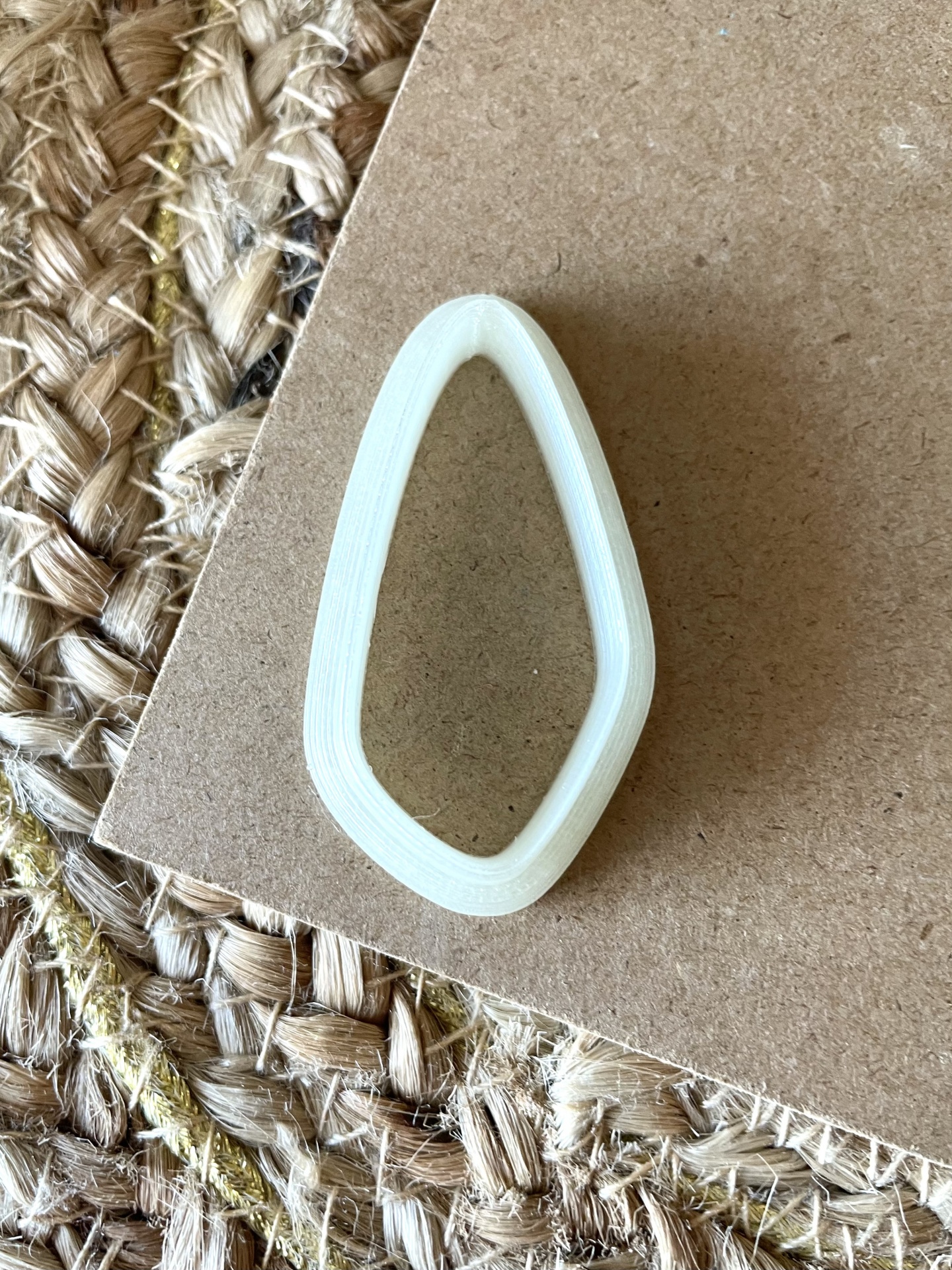 • Anel translúcido com formato pontiagudo sobre cartão castanho e tapete de fibras naturais.