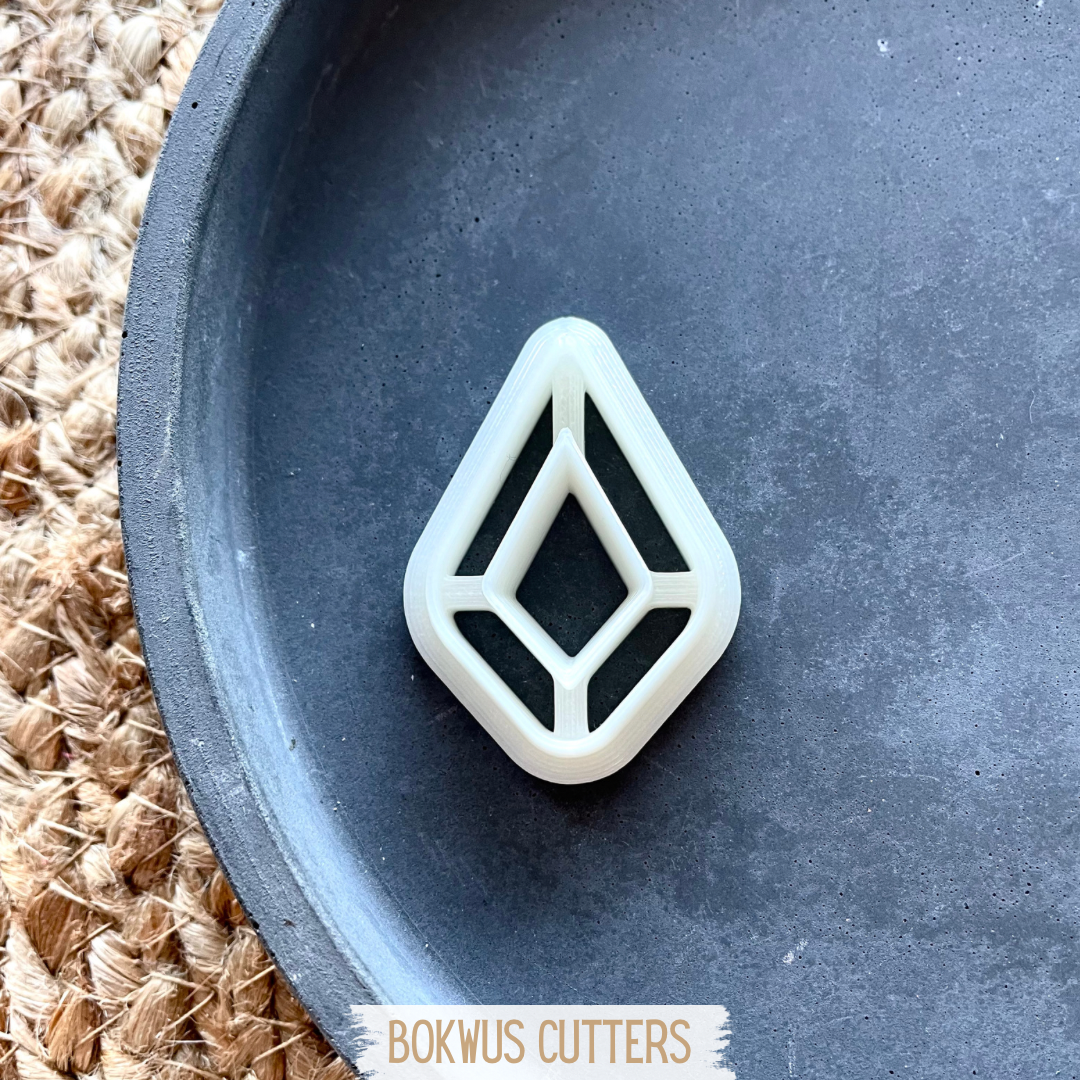 • Cortadores de massa brancos e beige em forma de losango sobre prato branco, etiqueta BOKWUS CUTTERS