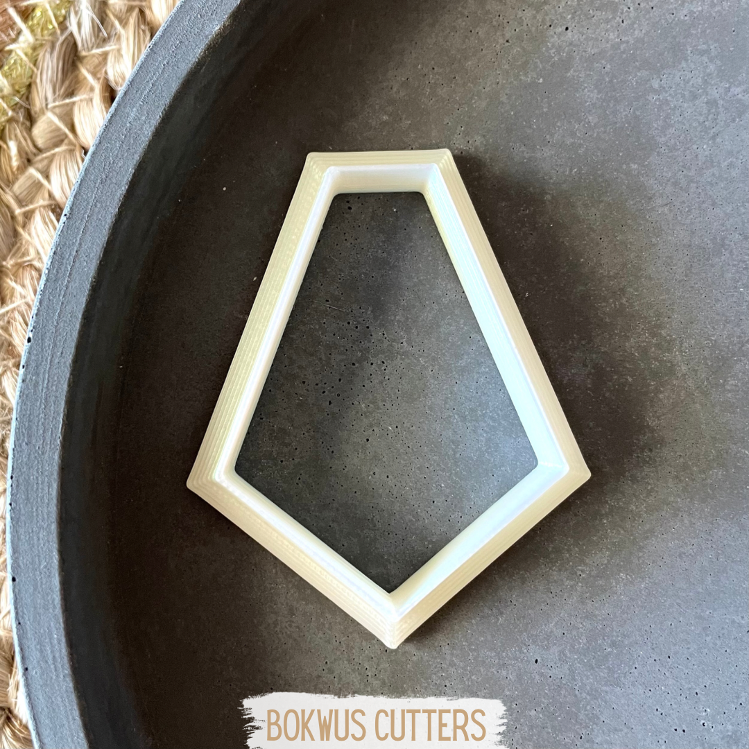 • Cortador de biscoitos pentagonal branco sobre superfície cinza e tapete de tecido trançado