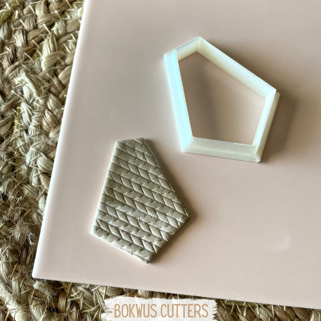 • Cortador de massa pentagonal branco e massa bege texturizada sobre placa rosa