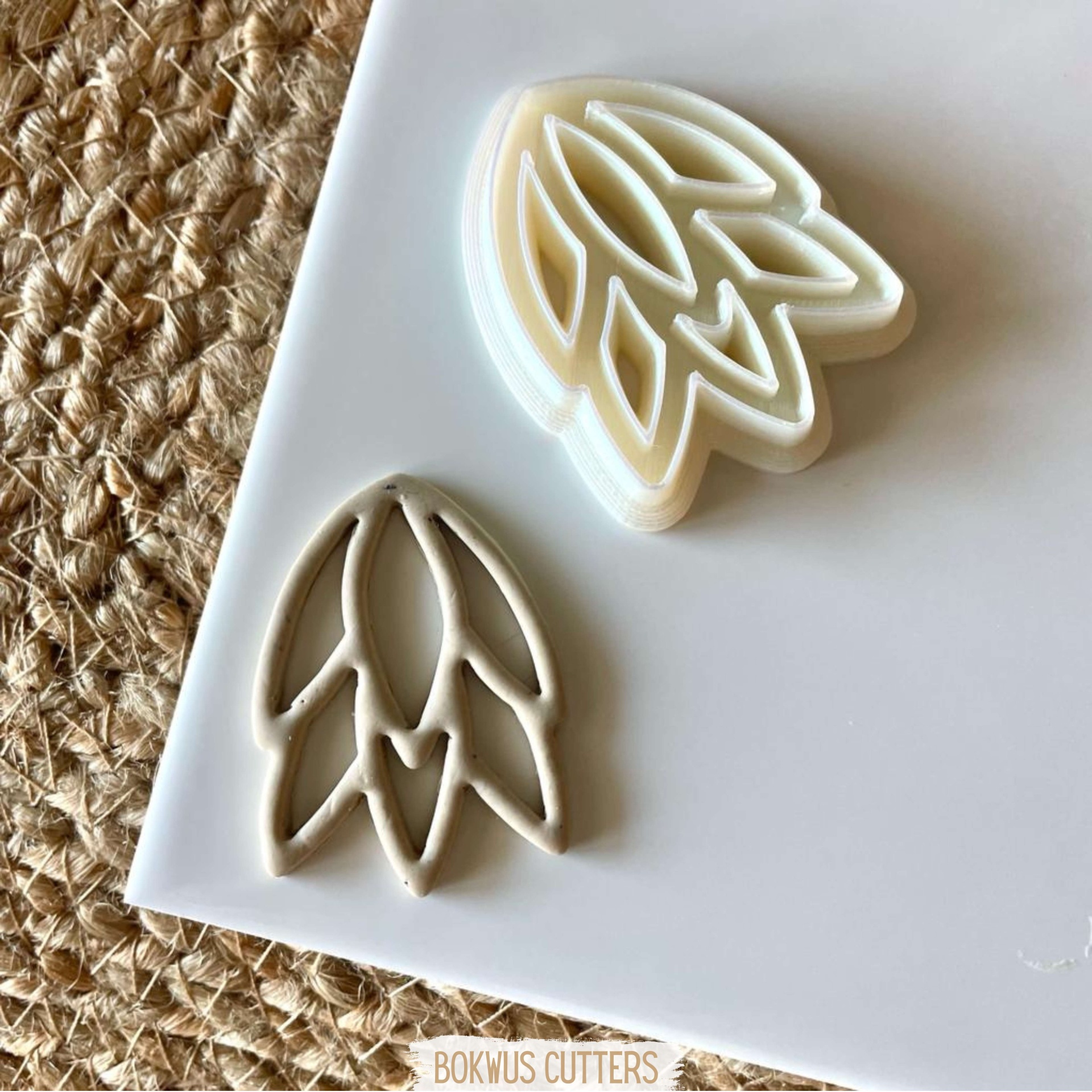 • Cortadores de biscoitos em forma de folha, brancos, sobre superfície branca e tecido bege.