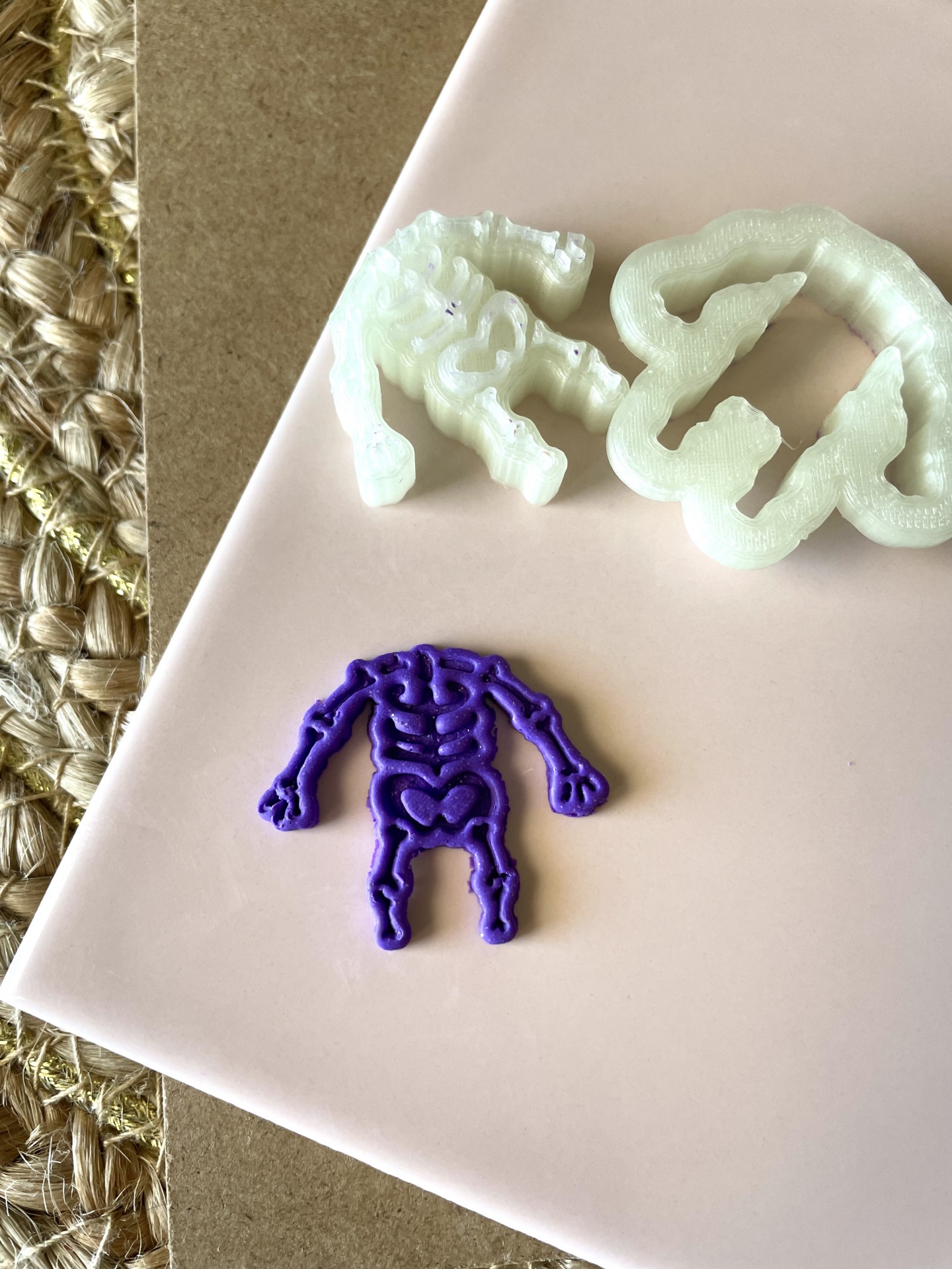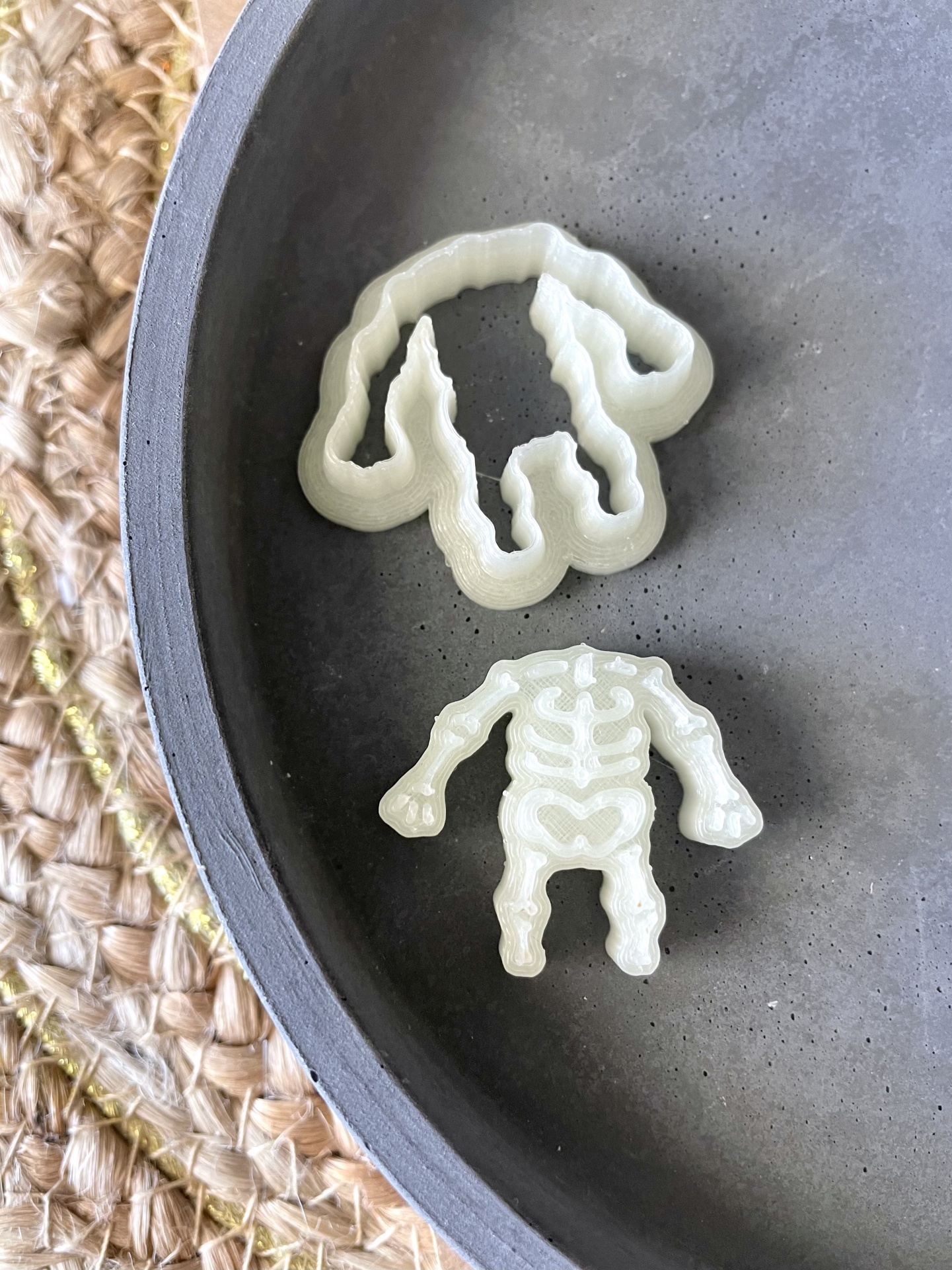 Dois cortantes de plástico para bolachas, um em forma de cachorro e outro de esqueleto, sobre prato cinzento e tecido trançado