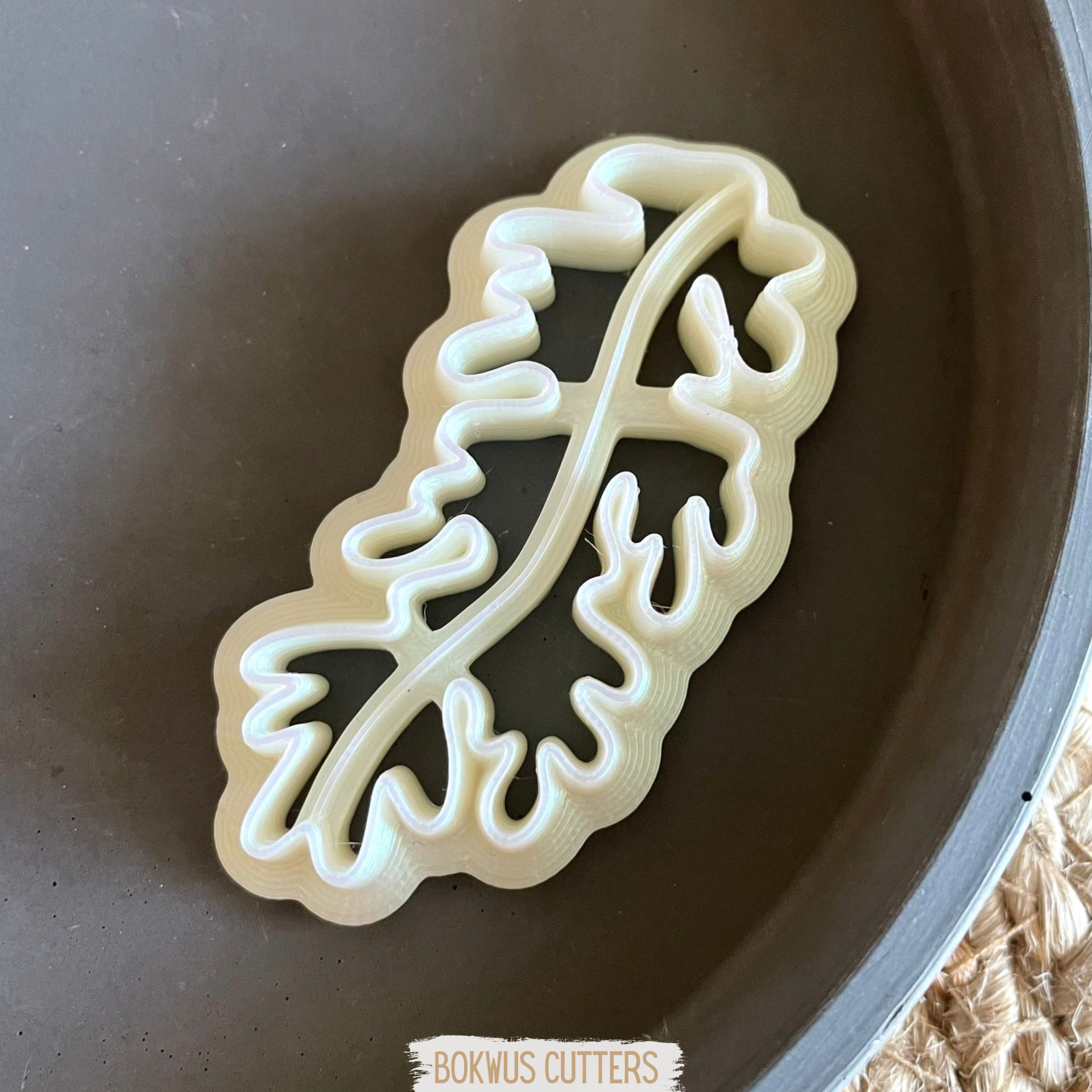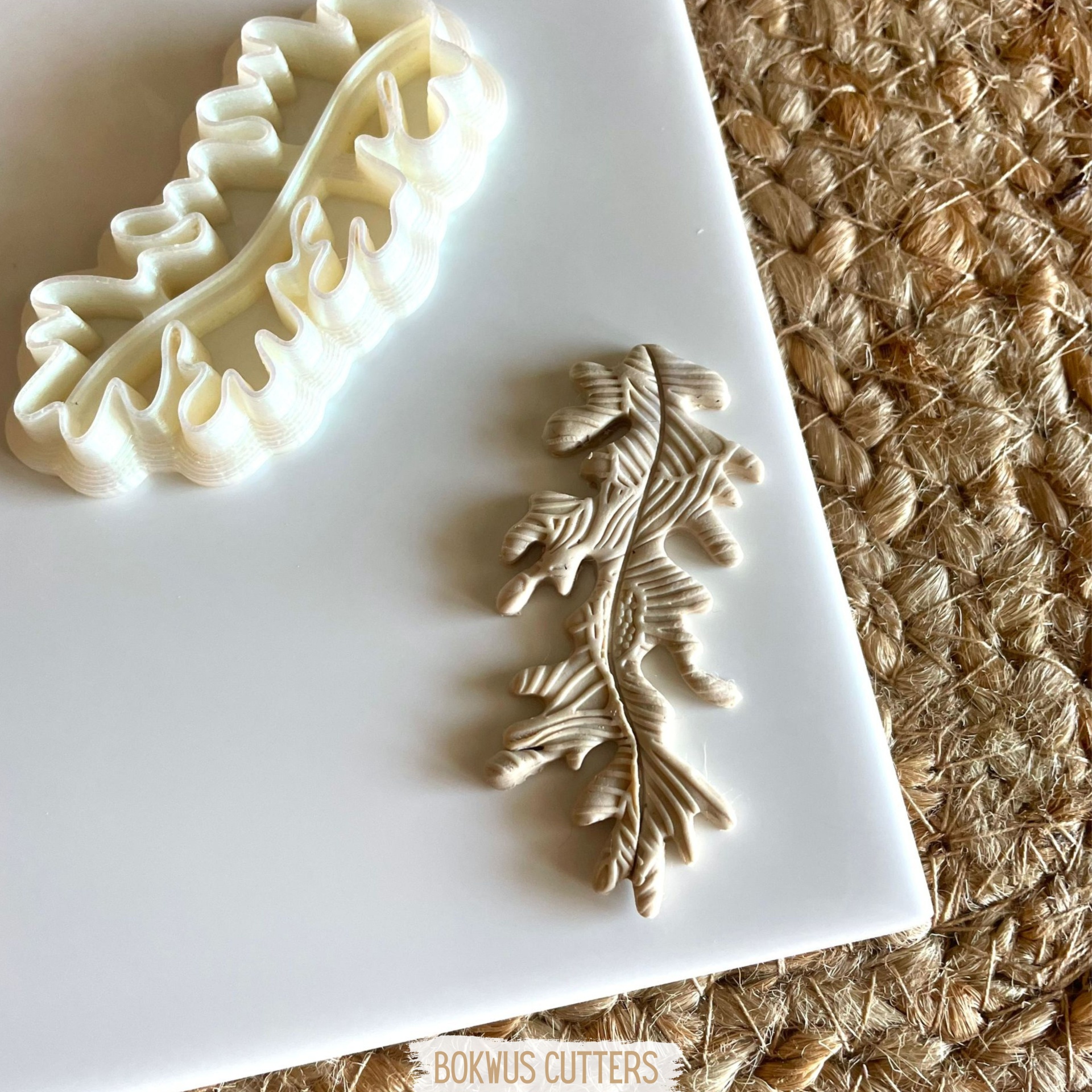 • Cortador de massa creme em formato de folha com impressão de massa bege sobre placa branca e tapete rústico castanho.