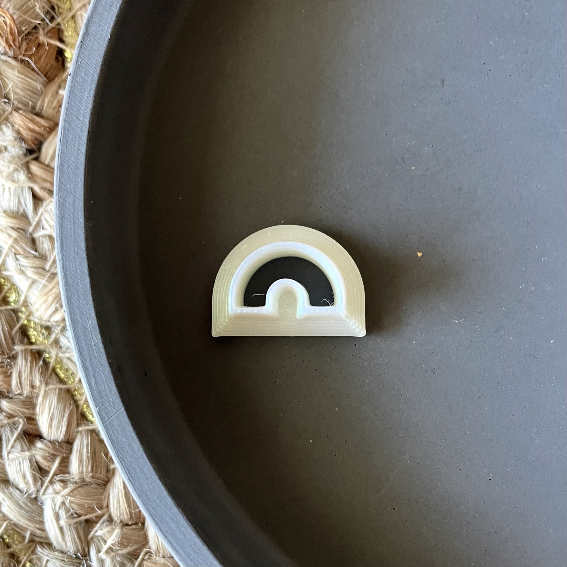 • Peça plástica bege em semicírculo num prato cinza