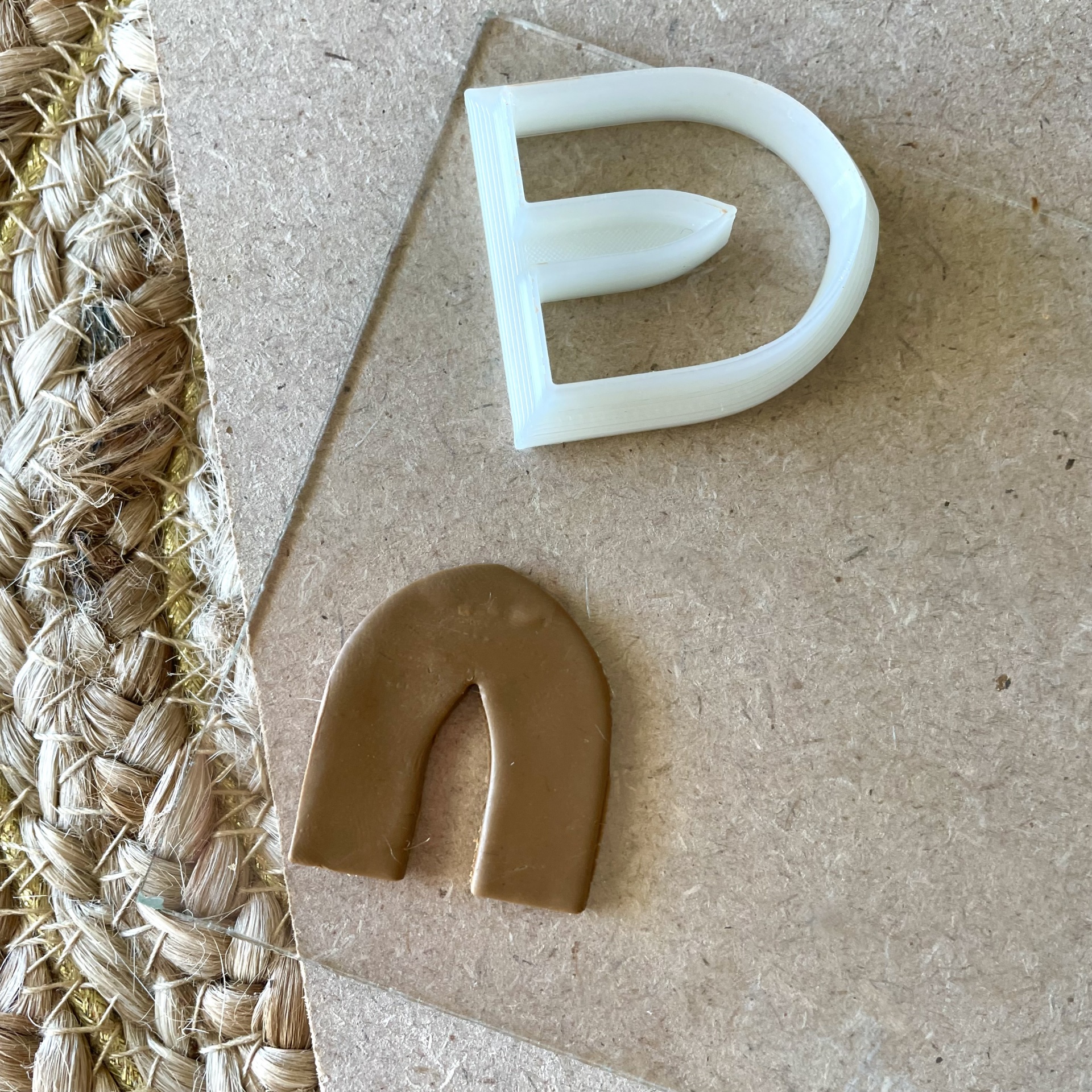 • Molde castanho e objeto de silicone branco sobre superfície de madeira clara e tapete de fibra natural