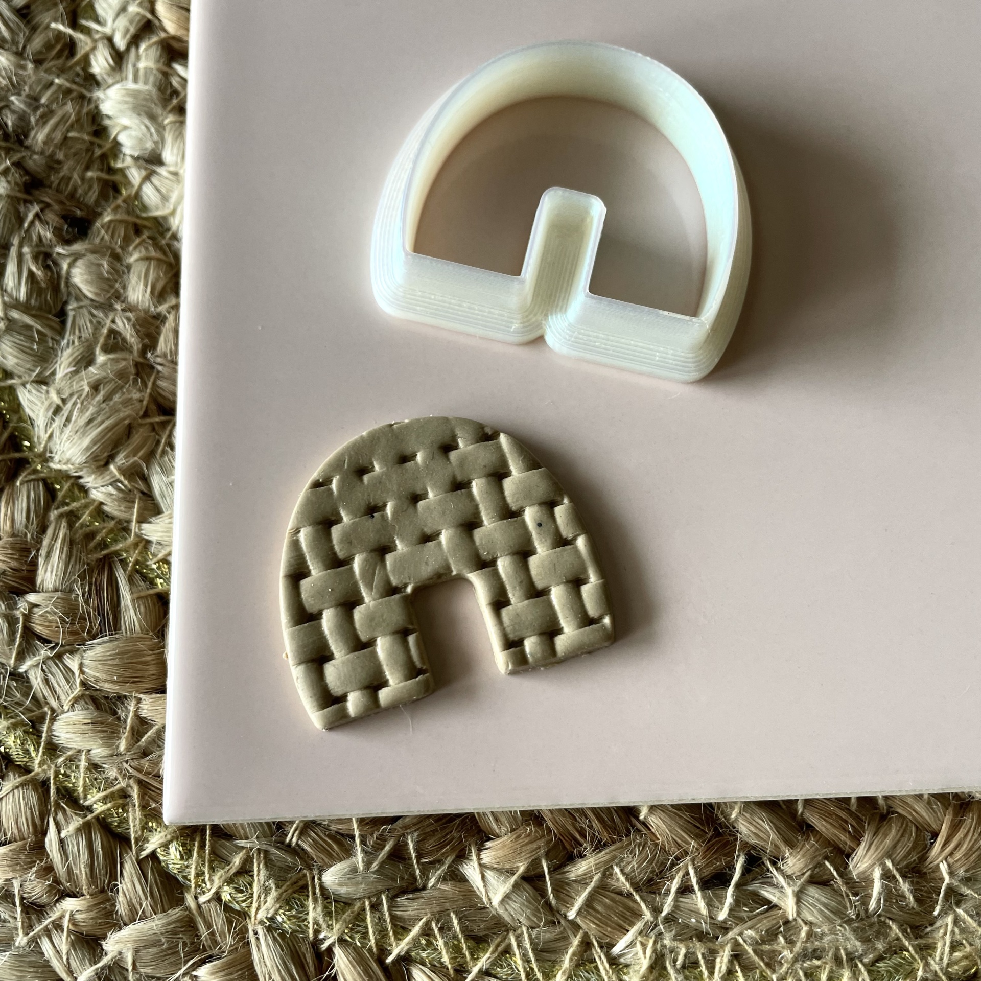 • Cortador semicircular branco e molde bege de padrão de cesta sobre superfície clara e tapete de fibras