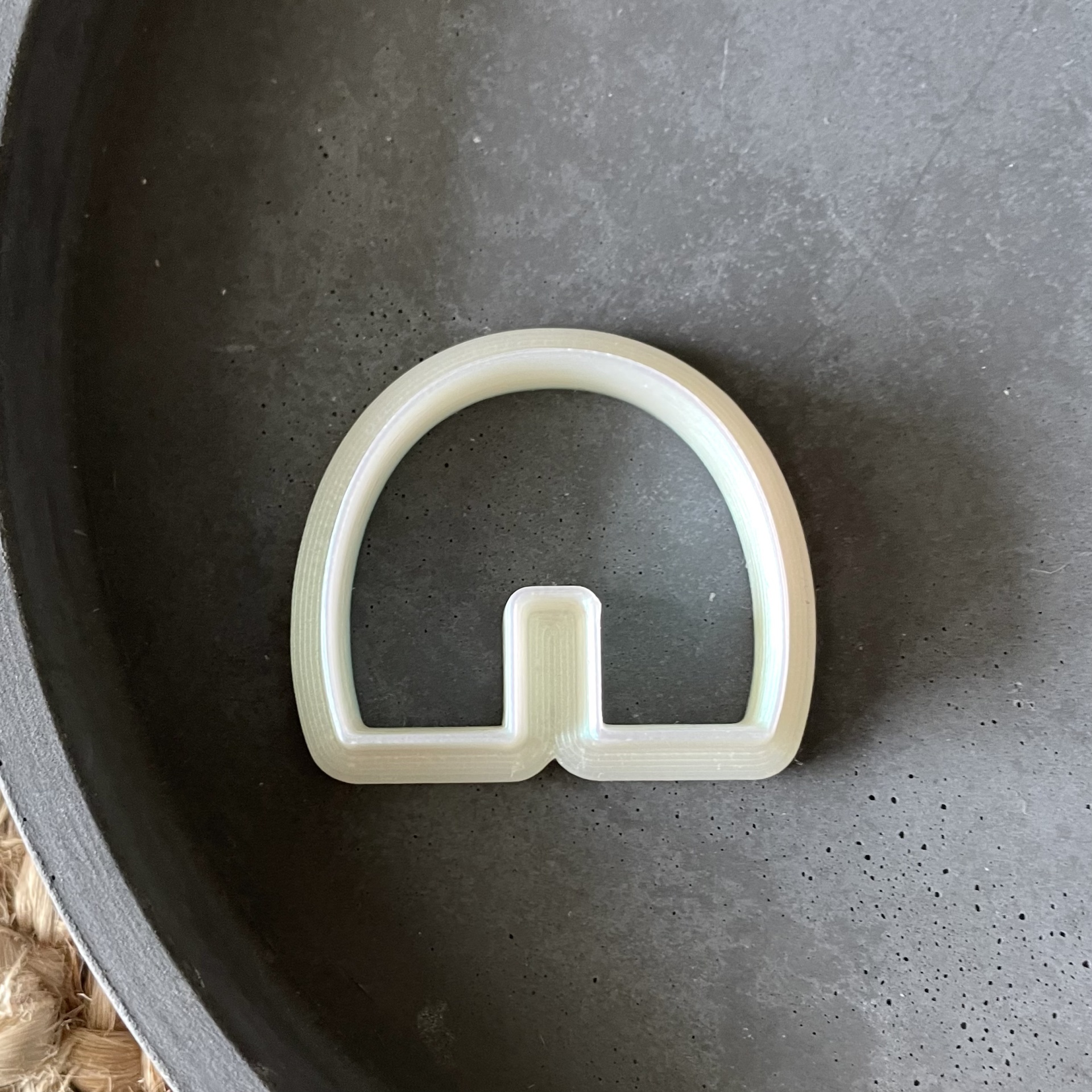 Objeto plástico branco em forma de arco sobre superfície escura circular