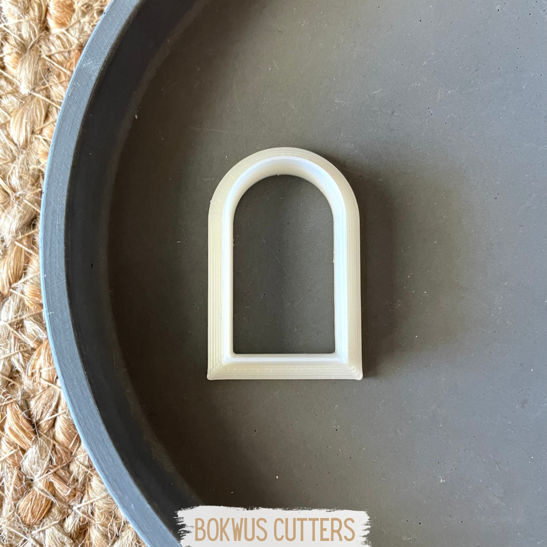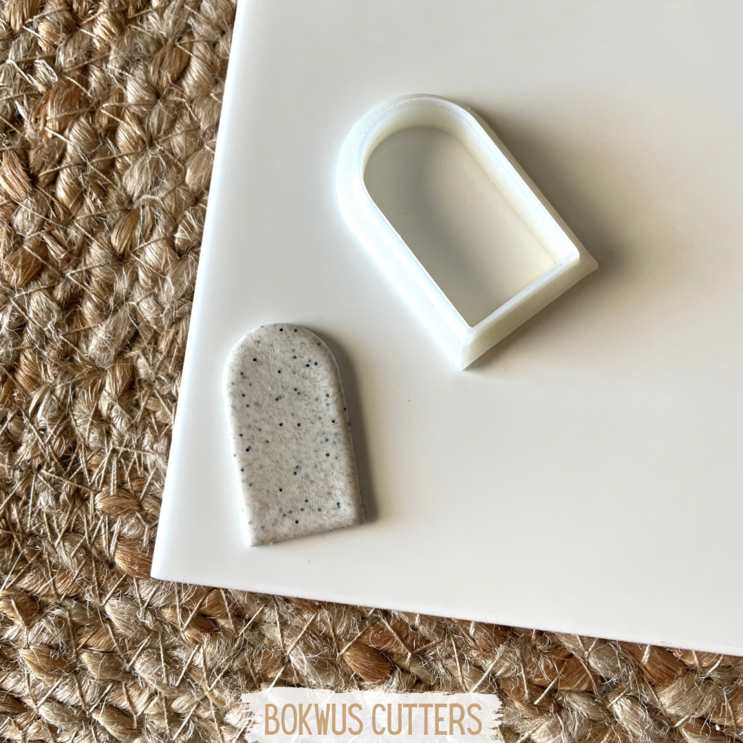 • Cortador de biscoitos em forma de arco branco com massa cinzenta e pontos pretos sobre superfície branca e ráfia com texto BOKWUS CUTTERS