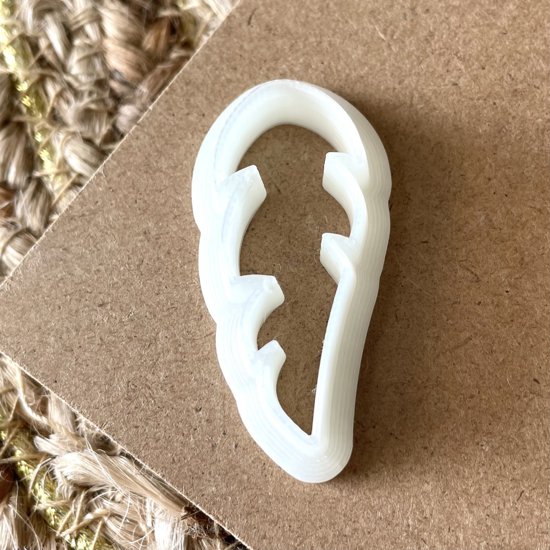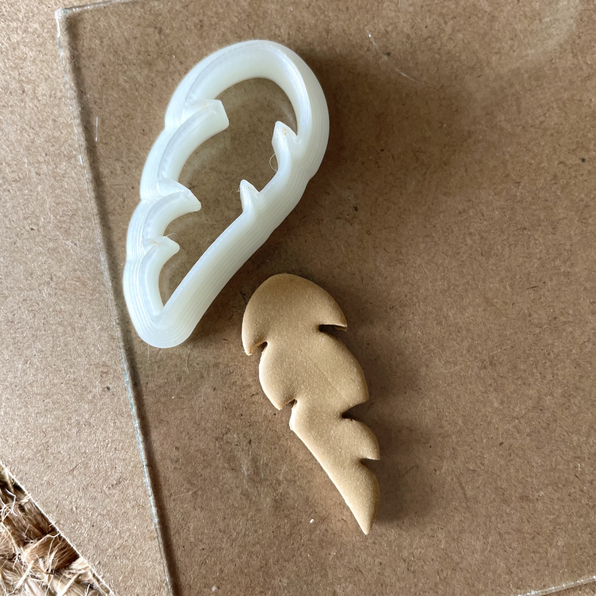 • Cortador plástico branco e peça de couro bege em forma de pena sobre cartão marrom