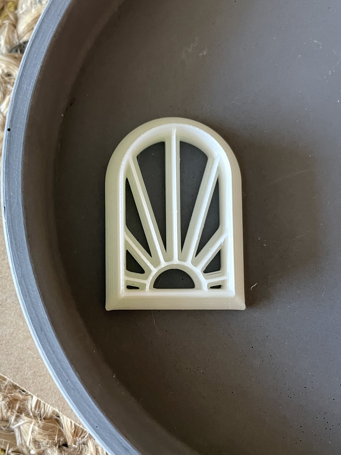 Peça decorativa branca em forma de arco com padrão de raios