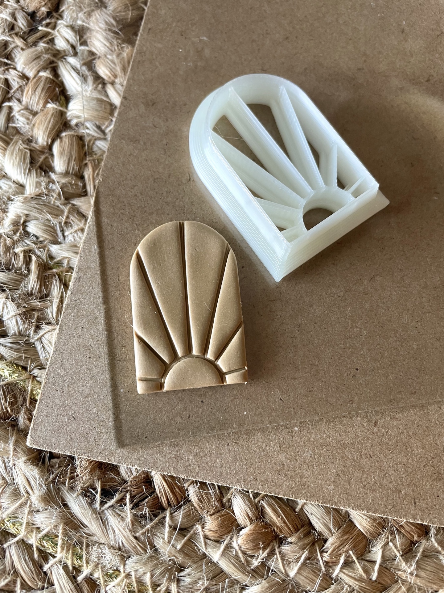 • Dois objetos arqueados, um bege e outro branco, com padrão de sol, sobre superfície castanha e tapete de fibras.