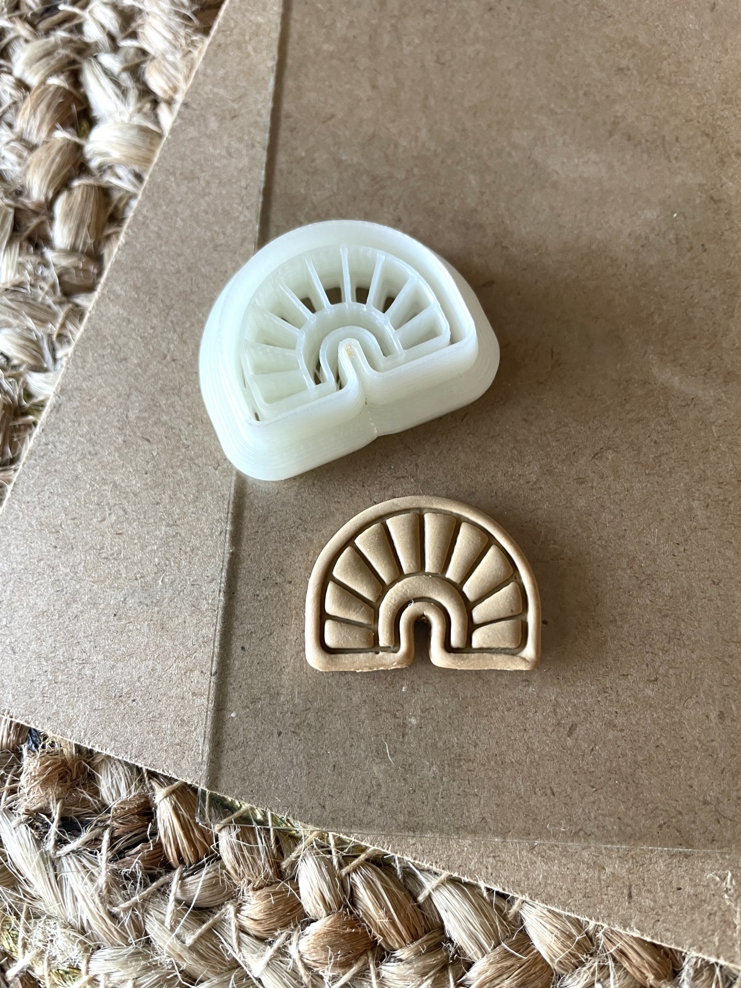 • Moldes semicirculares branco e castanho com padrão de linhas em área castanha sobre tapete de fibras naturais