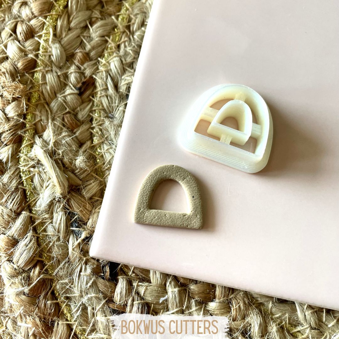 • Dois cortadores de massa em forma de arco, um branco bege e outro bege, sobre superfície rosa clara junto a tecido trançado