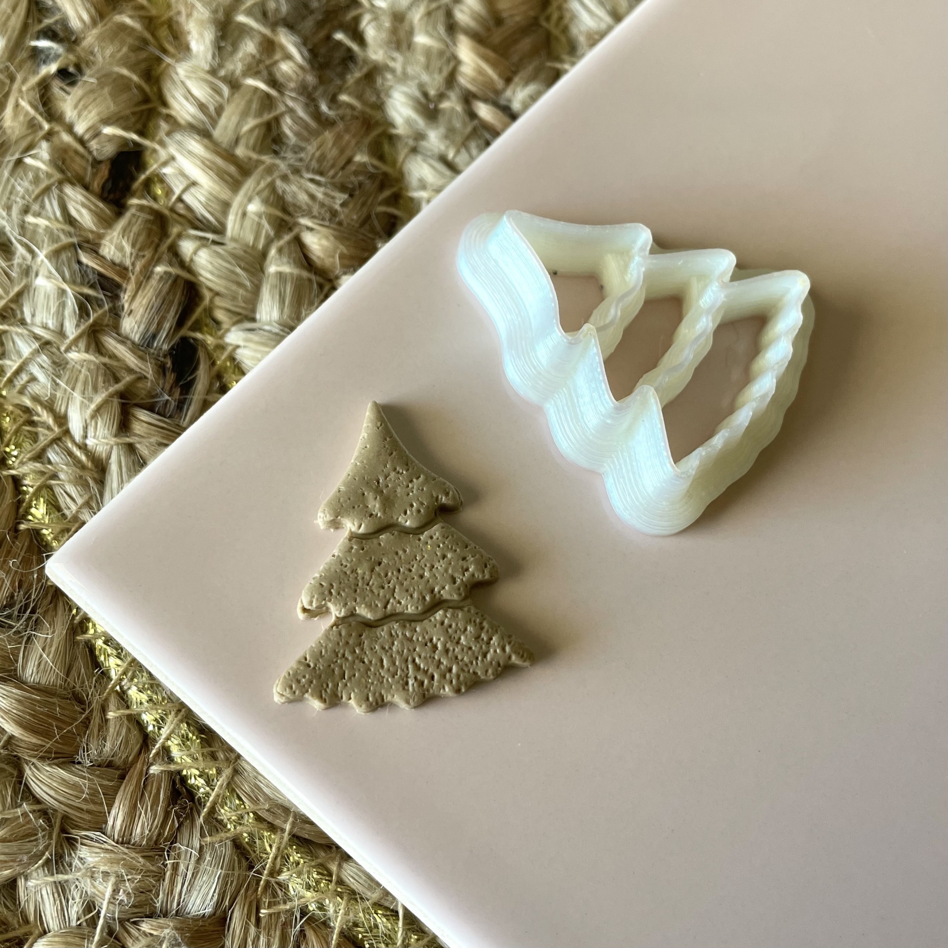 Moldes para biscoitos em forma de árvore de Natal e biscoito dourado sobre base rosa com fundo de tapete de fibra natural