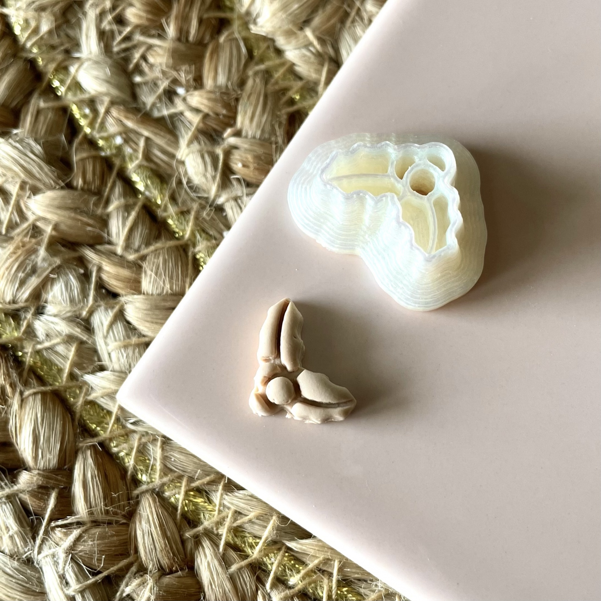 • Dois objetos pequenos em superfície rosa com fundo de fibras naturais entrelaçadas