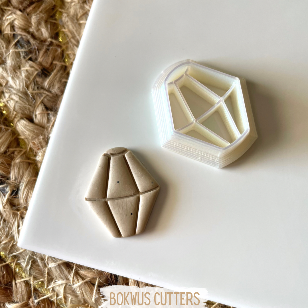 • Cortador de bolachas branco em forma geométrica sobre superfície cinza com texto BOKWUS CUTTERS