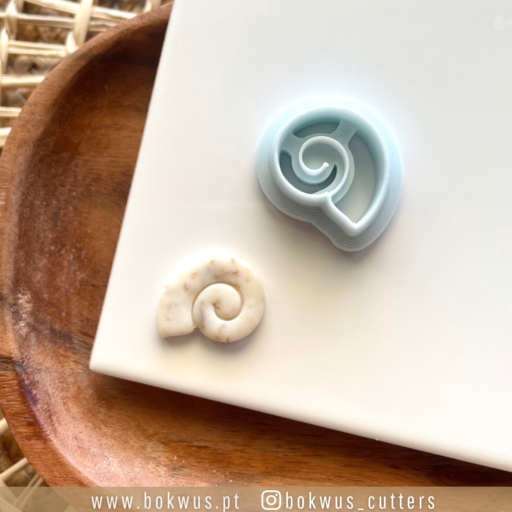 • Cortador de biscoitos em forma de concha e biscoito espiral sobre base branca e madeira