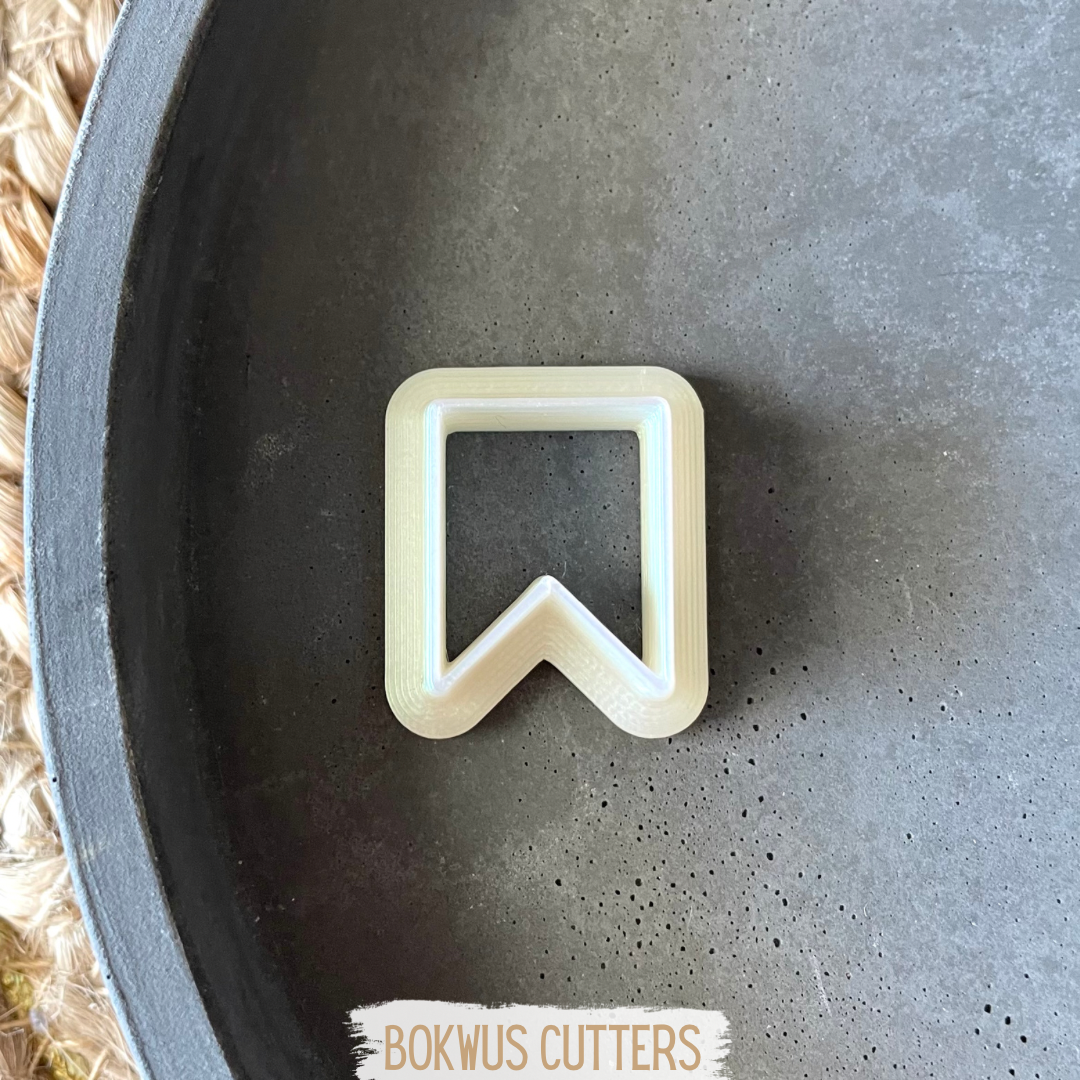 • Cortador de biscoitos branco em forma de bandeira numa superfície cinzenta com etiqueta BOKWUS CUTTERS