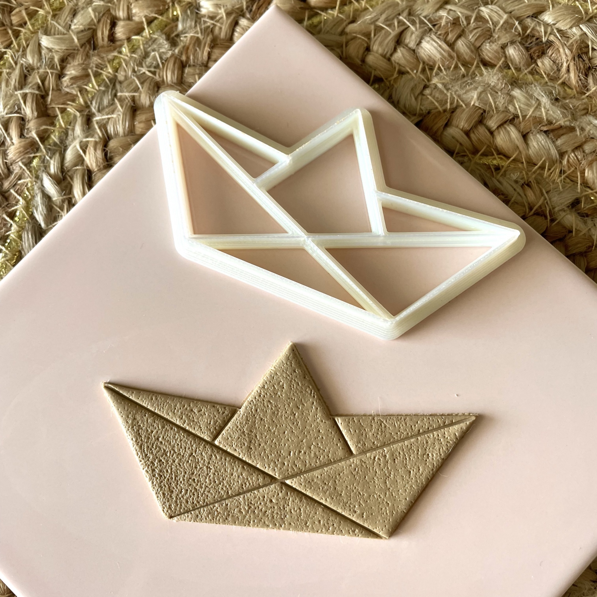 Cortador de biscoitos branco em forma de barco de papel sobre placa rosa com biscoito texturizado no mesmo formato
