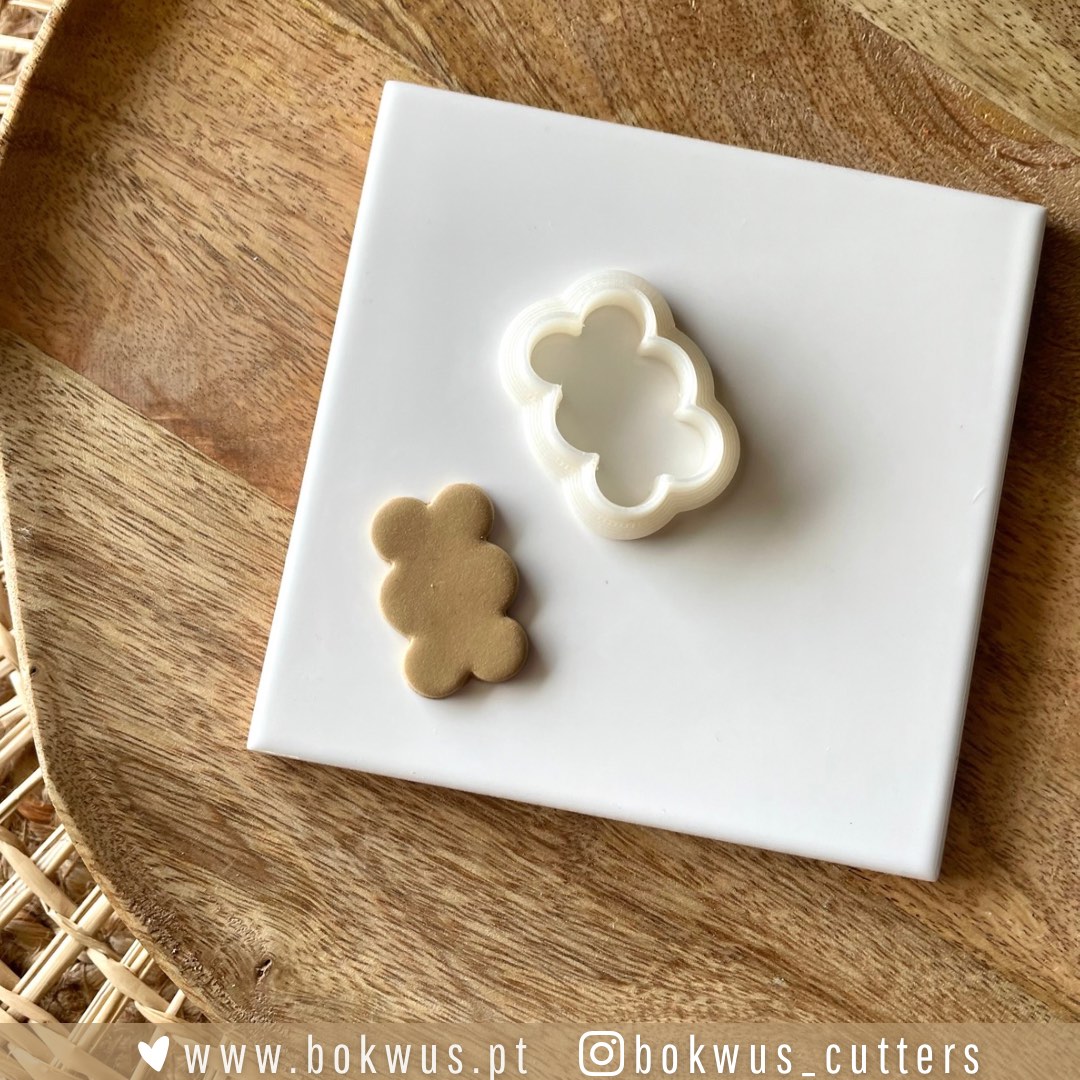 • Forma de corte branca em forma de nuvem e bolacha dourada numa placa branca sobre madeira